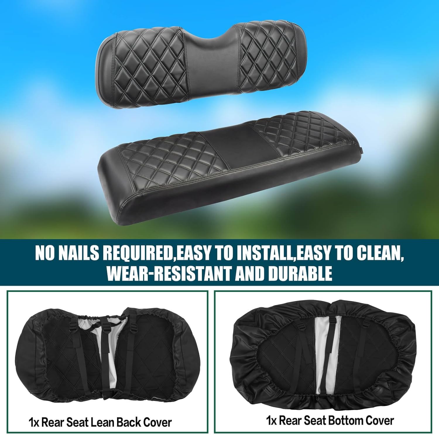 NOKINS Golf Cart RS Diamond Seat Cover for Standard Seat Cushion Aftermarket Back Seat Kit, No Staples Required,Golf Cart Vinyl Replacement Seat Cover Black Stitching