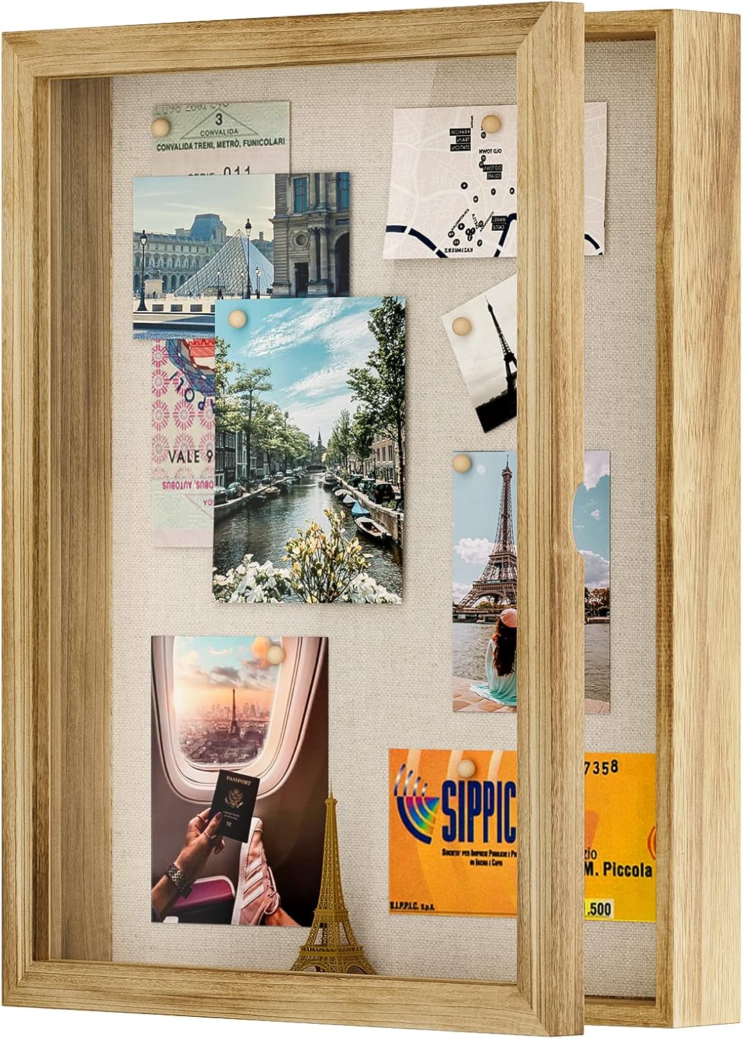 - Material-Solid wood shadow box with torched texture on the surface of the frame to retain the natural grain. Each display case is equipped with a piece of dustproof glass, making the contents as new for a long time. Built-in linen lining and 12 fixing nails to help you arrange the large shadow box.