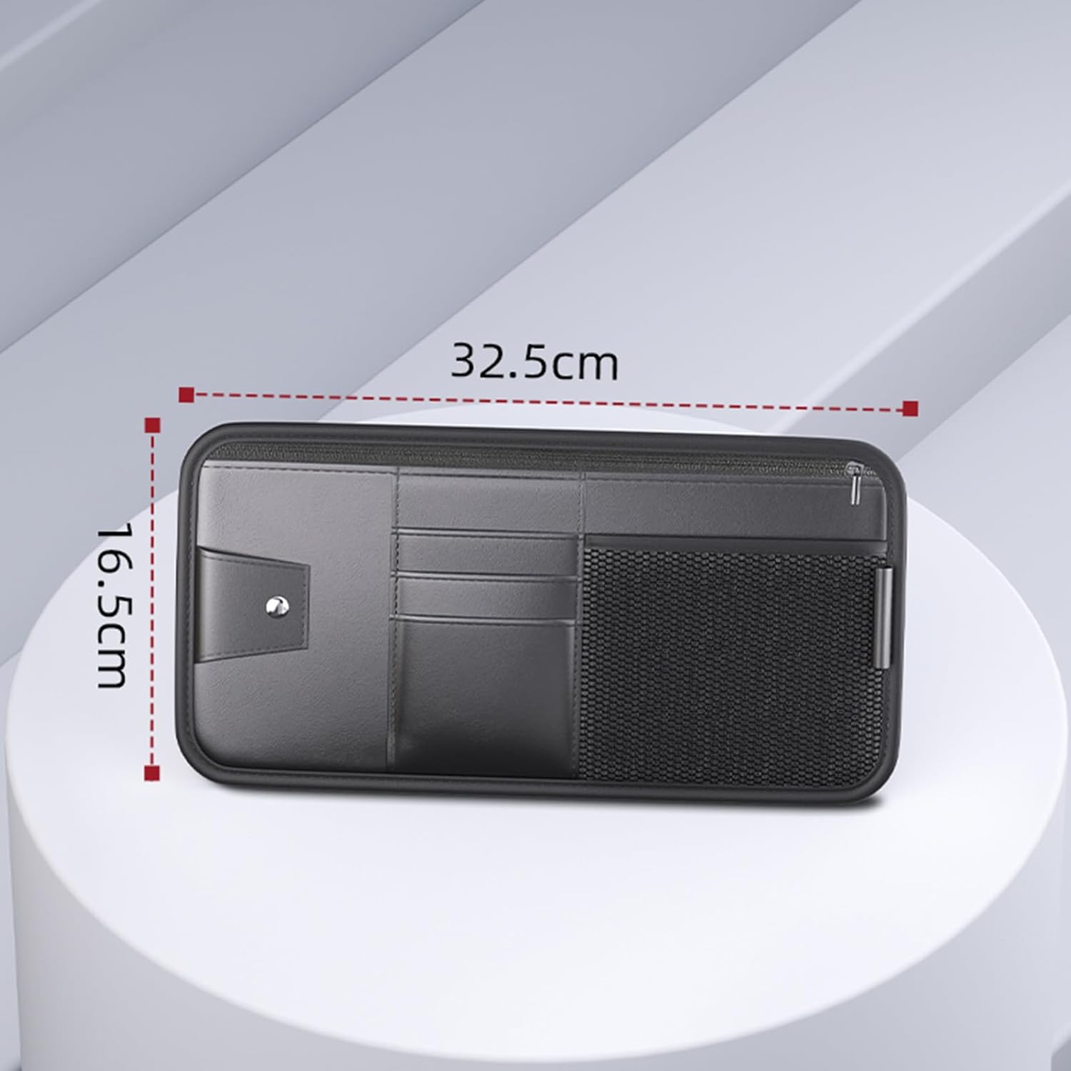 - đźš—Large Capacity Car Sun Visor Organizer, is Perfectly Designed to Fit Most Cars, SUV, Jeep and Trucks.It Has 1x Zipped Big Compartment, 1x Pen Slot, 2x Card Holder Pockets, 1x Mini Mesh Pocket and 1x Glasses Case.