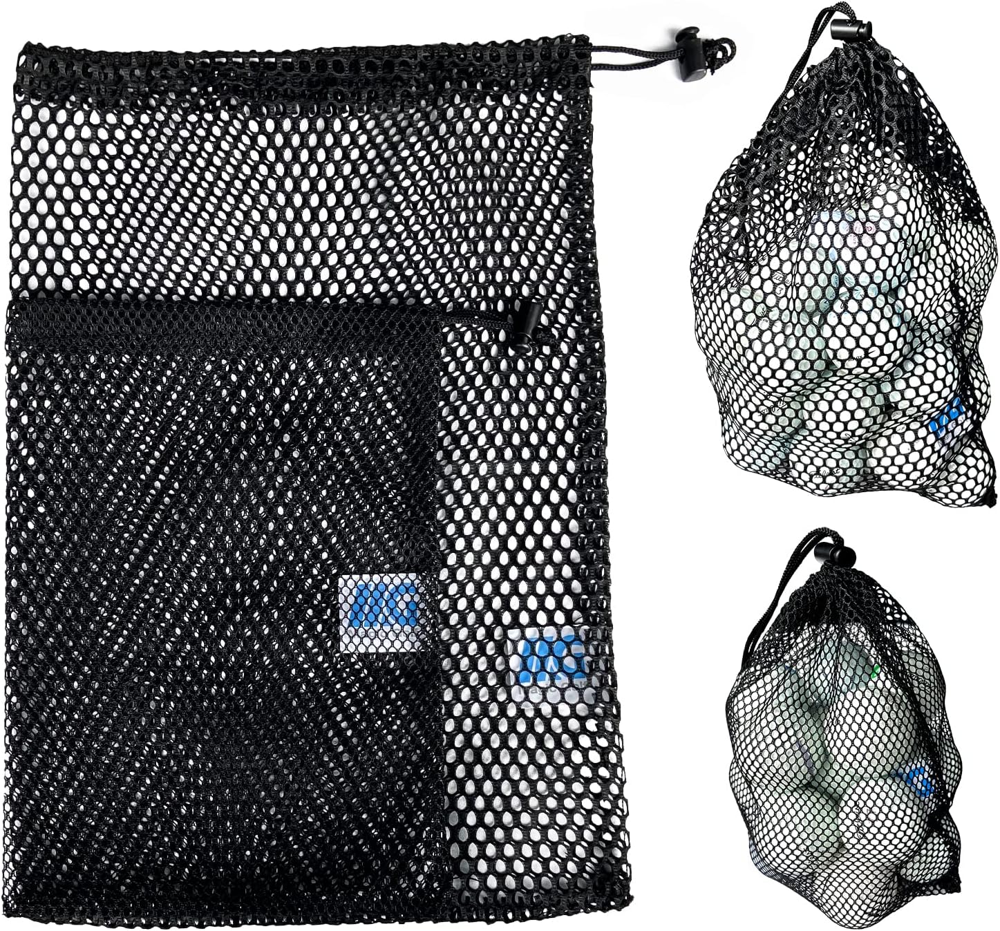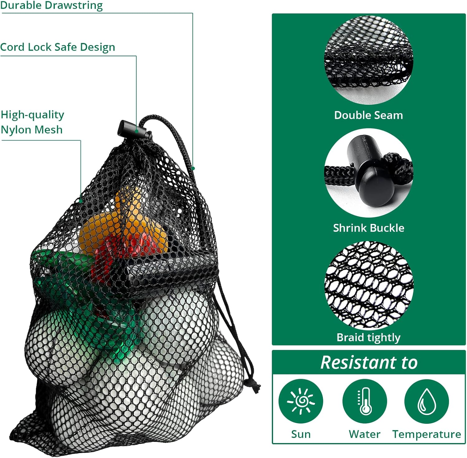 - 【2-Different Size Mesh Bags】 Combination packaging of large and small mesh bags. - (13.4 x 9.5inch - up to 55 golf balls storing, 9 x 6.7inch - up to 25 golf balls storing) - Made from heavy-duty nylon-mesh material, no-tear, durable, lightweight, breathable. Convenient for carrying and storing, save space, which can be applied for many places.