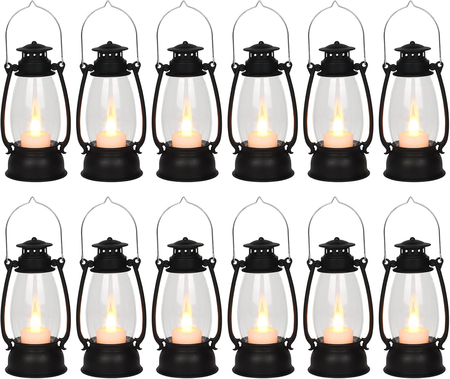 12Pcs Mini Lantern for Cowboy Halloween Christmas Wedding, Black 6" Candle Lantern with Flickering LED for Camping Western Party Decorations, Table Centerpiece, Hanging Lamp Ornaments Bulk
