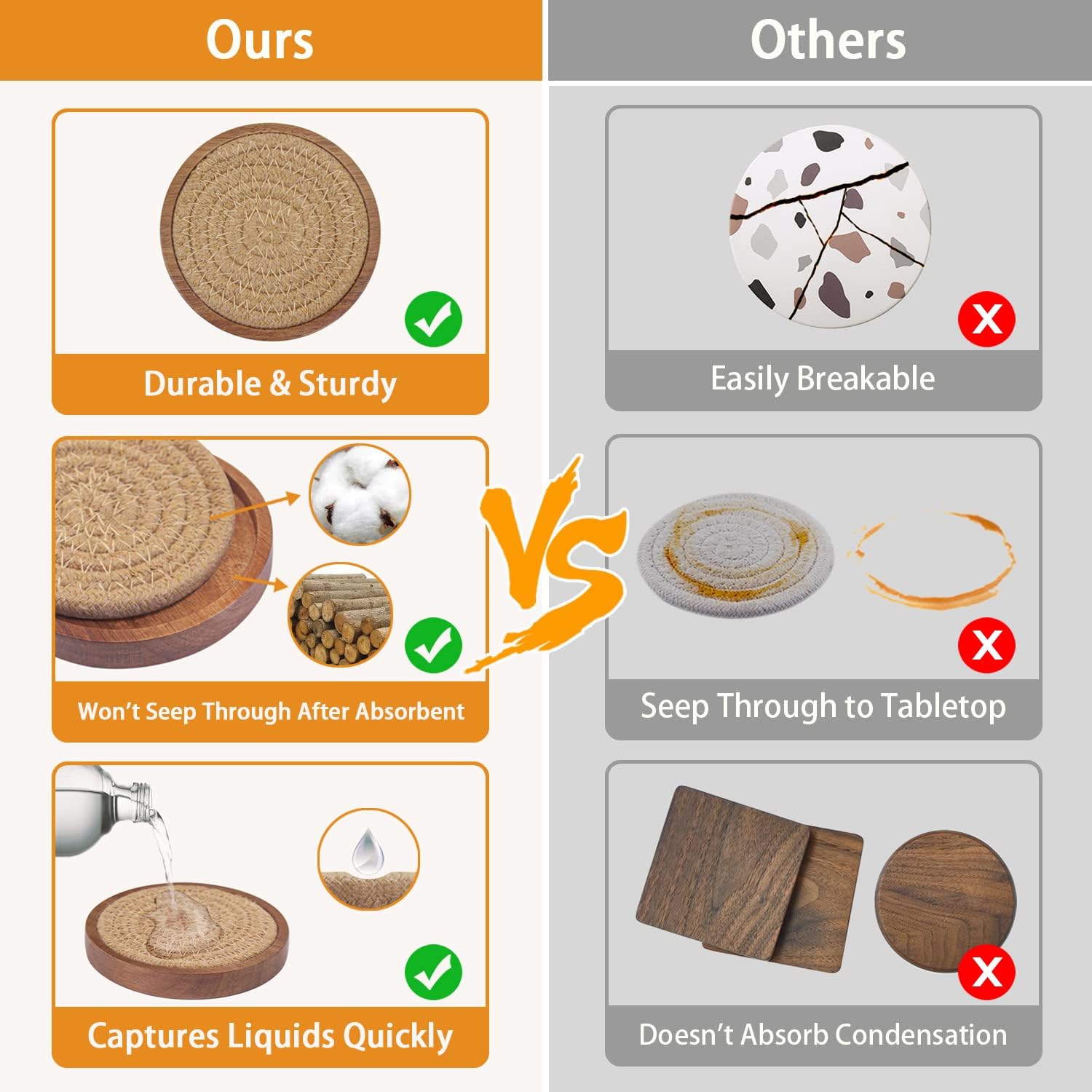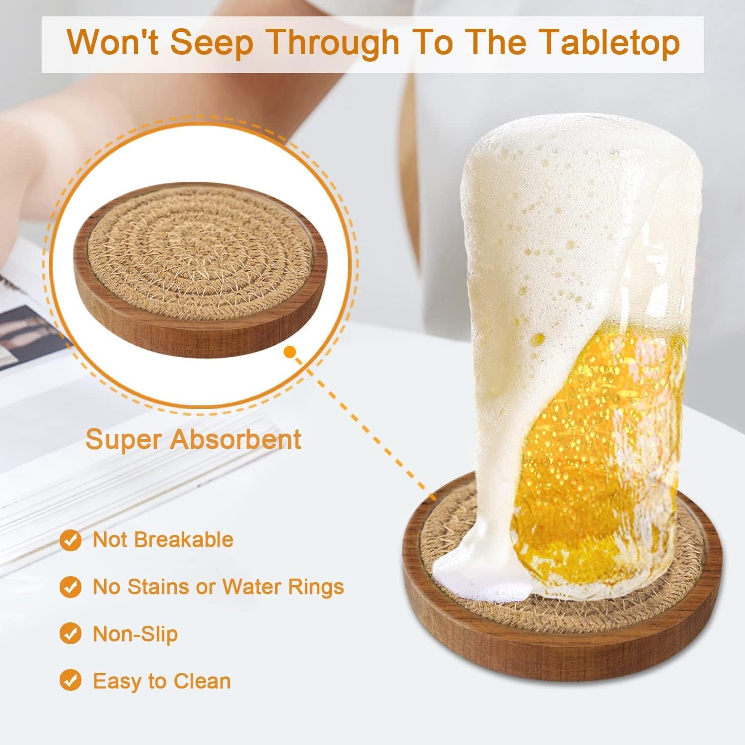 - 【Coasters with Holder】: Original Design & Patented Product, the coaster set comes with a practical metal holder for easy storage; the coasters are woven inserts and wooden base construction that can absorb a larger amount of condensation and ensure moisture does not permeate on the table, keep the table dry to prevent stains or water rings.