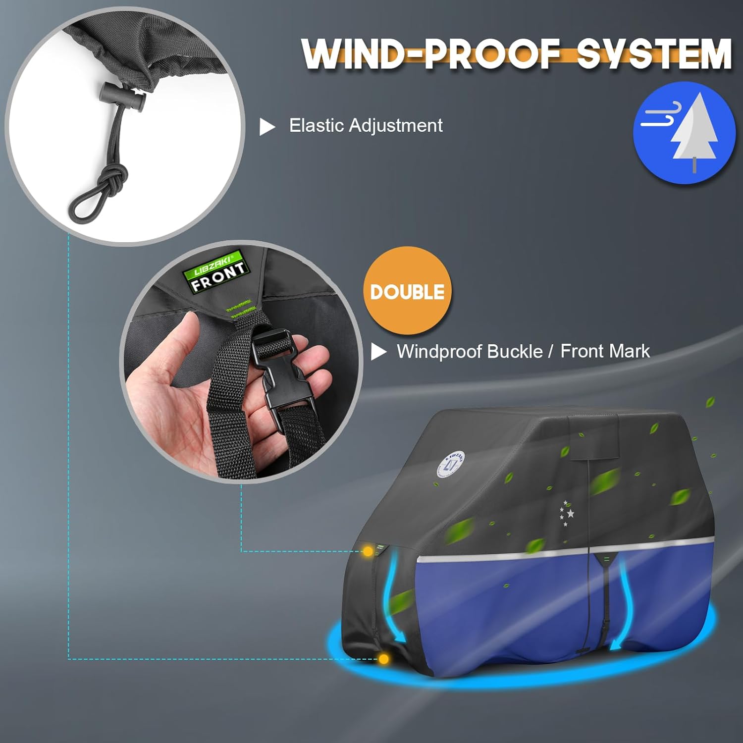 - Unique Exterior Design: ①Clever color matching and wonderful pattern embellishment design,Make your golf car cover stand out. ②Front,rear,left,right has adjustable windproof buckles,Adjustable Hem Cord,all-round windproof. ③Reflective strips on both sides have a night warning effect.