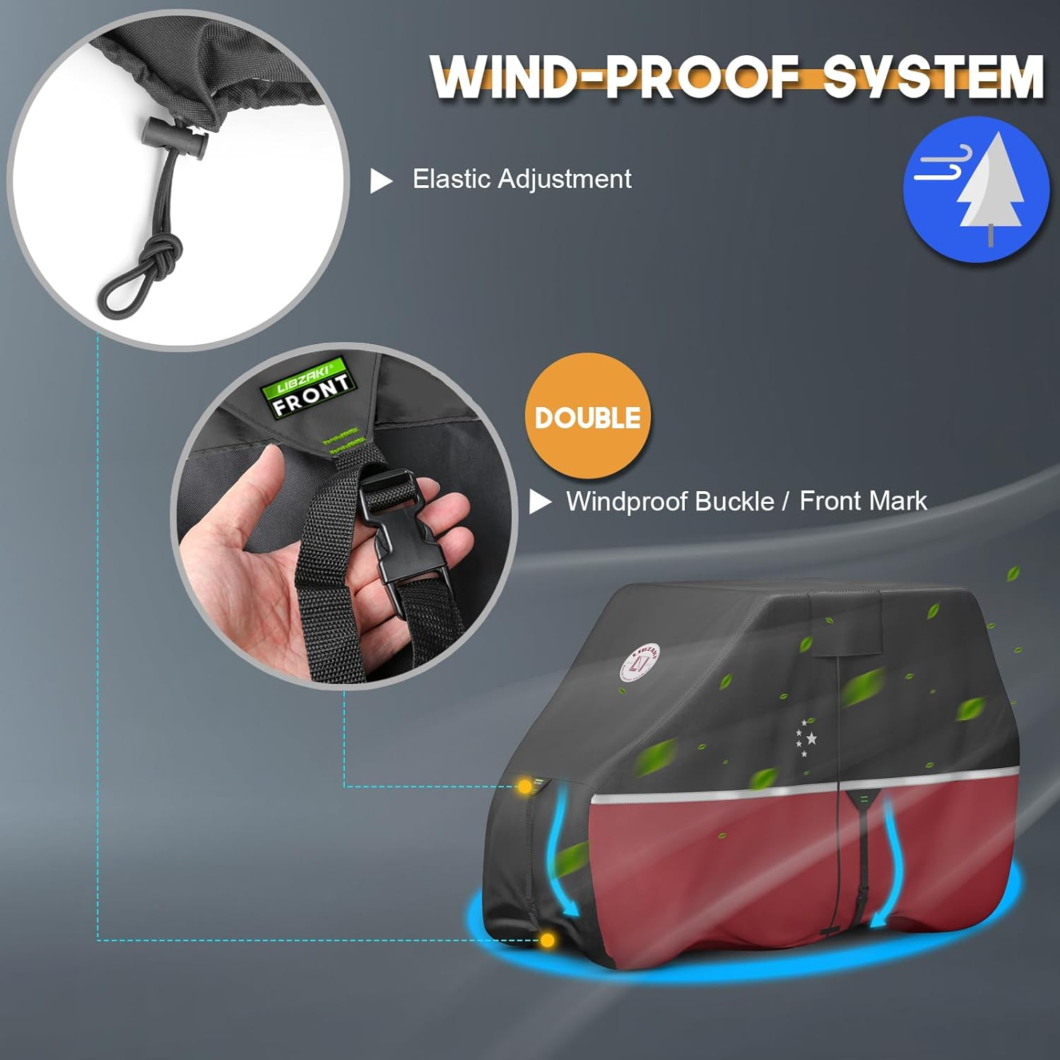 - Unique Exterior Design: ①Clever color matching and wonderful pattern embellishment design,Make your golf car cover stand out. ②Front,rear,left,right has adjustable windproof buckles,Adjustable Hem Cord,all-round windproof. ③Reflective strips on both sides have a night warning effect.