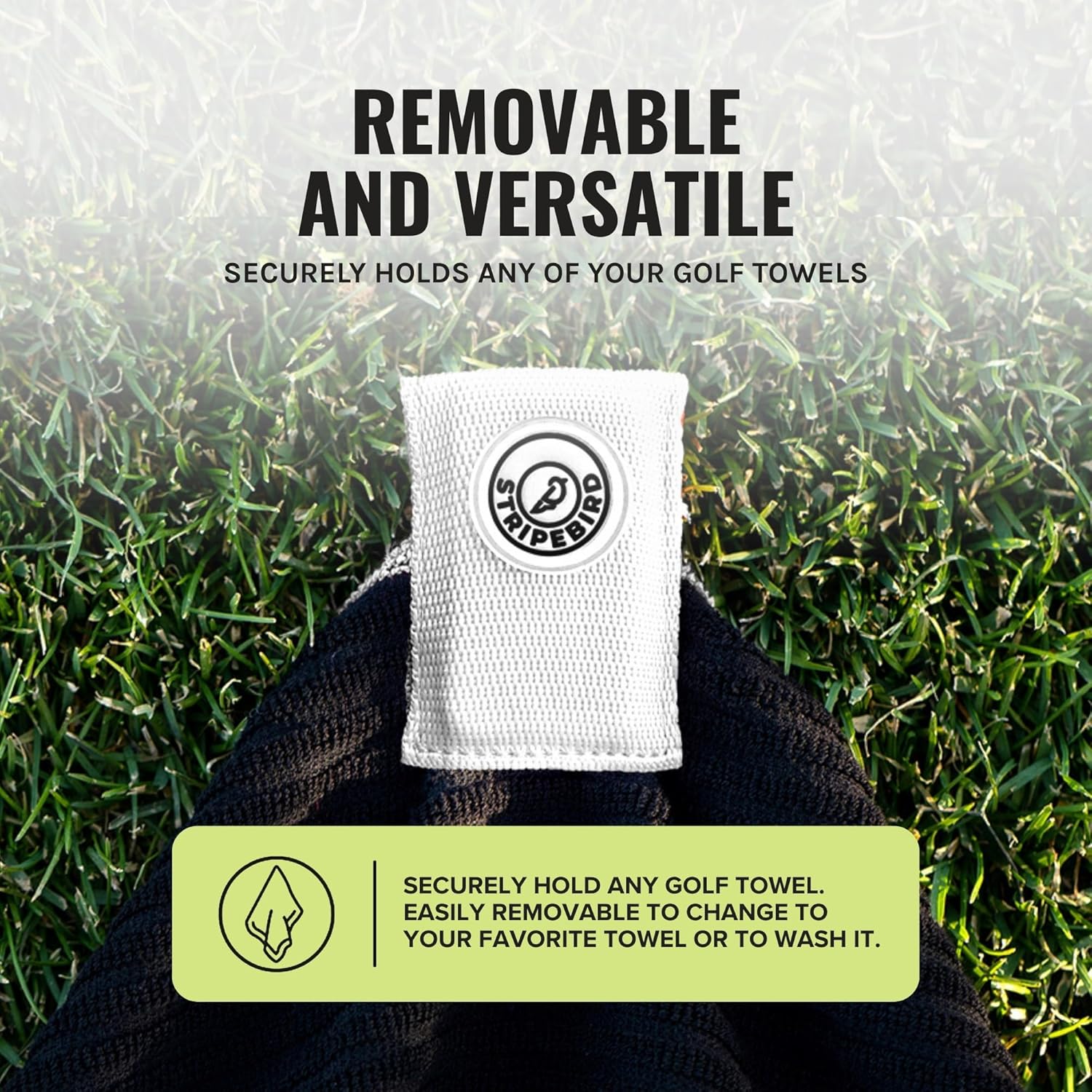 - COMPATIBLE WITH ANY TOWEL AND REMOVABLE: The Stripebird Magnetic Towel Clip is easily removable and can be used on any towel that you use. You can clip it onto any towel if you choose to change towels or to wash it. Attaches to golf bag magnet.