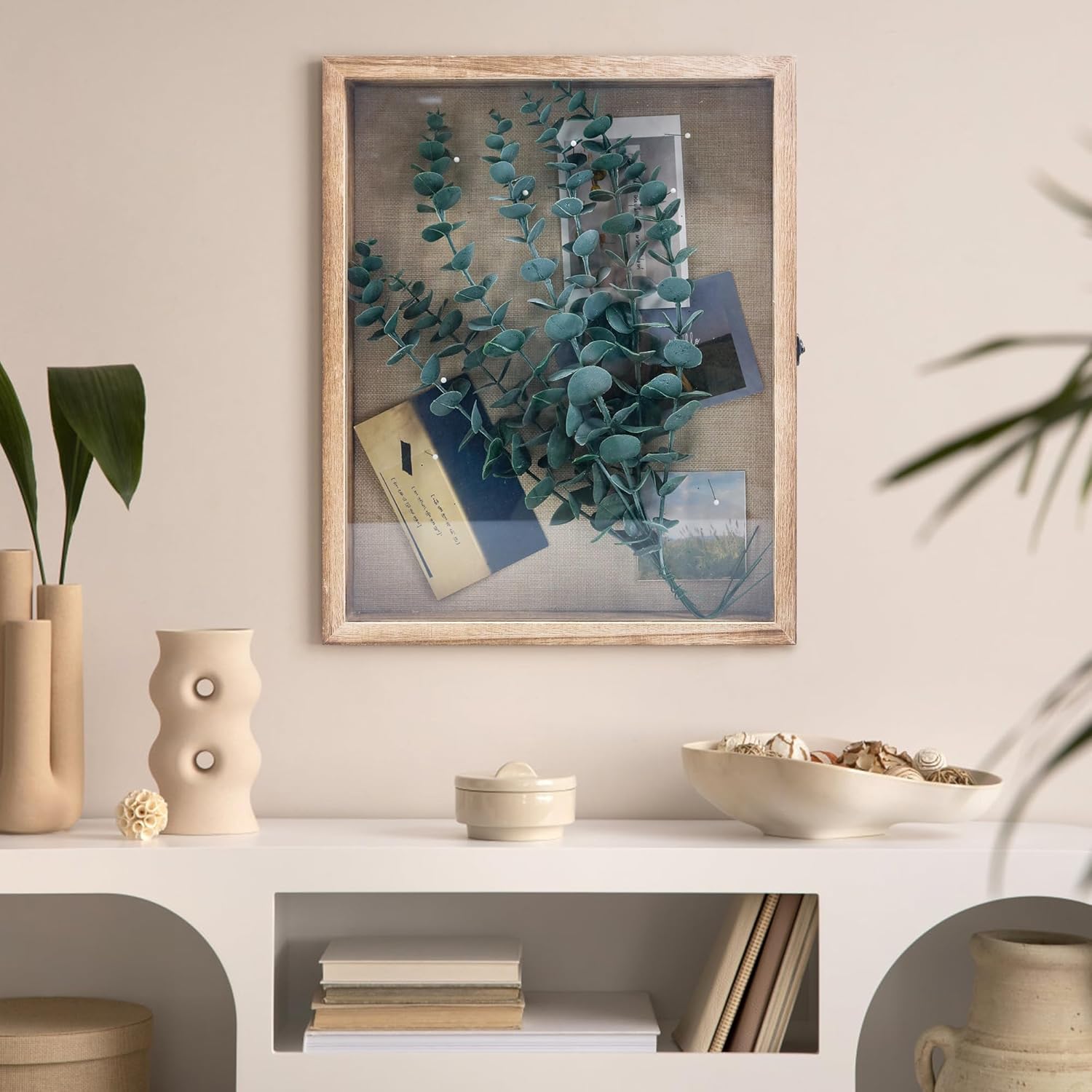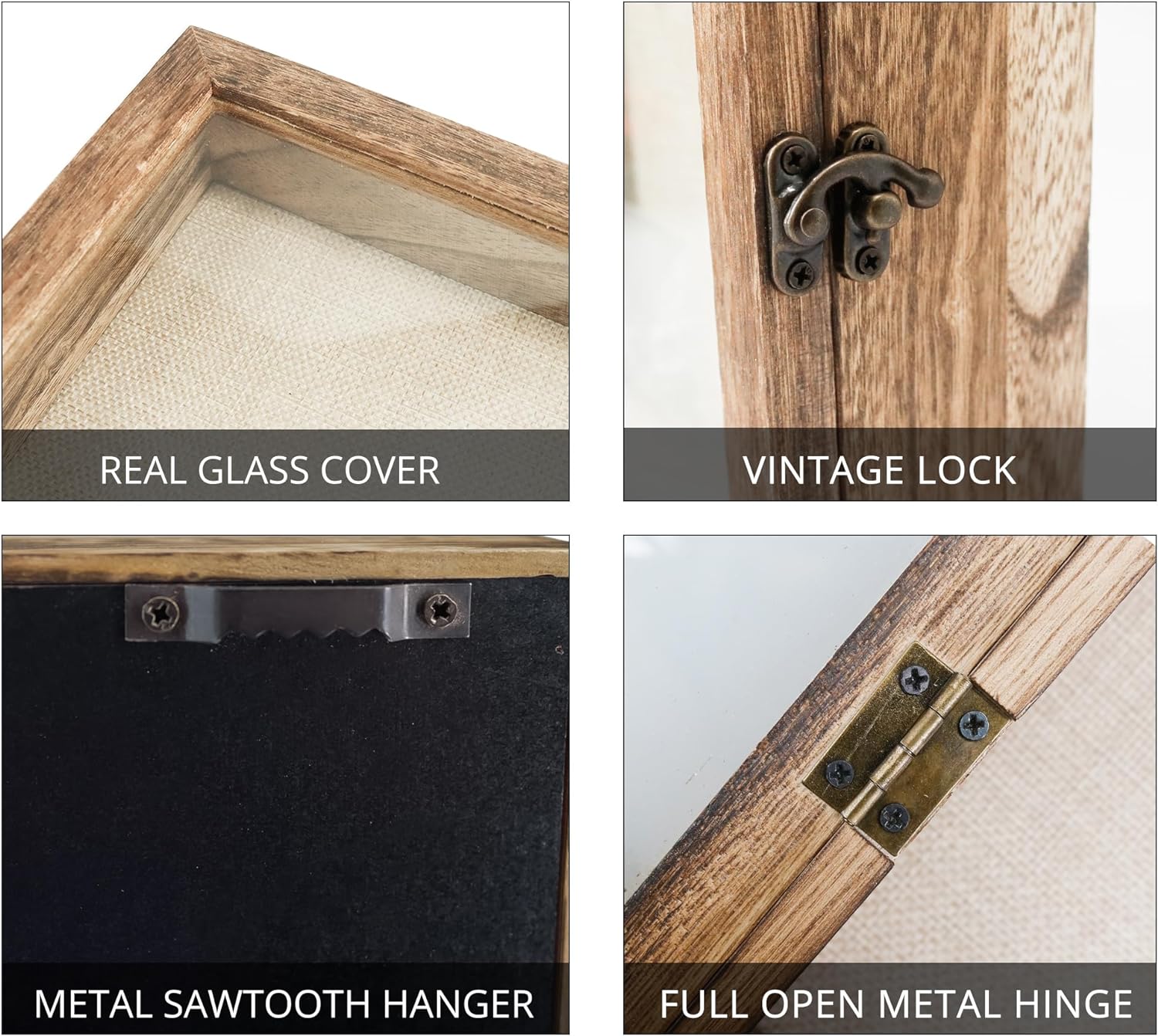 - High-Quality Materials – This shadow box comes with a solid, durable wood frame, woven fabric interior with 10 stick pins, hasp horn lock door with a REAL GLASS window, and two metal sawtooth hanging hooks on its back.