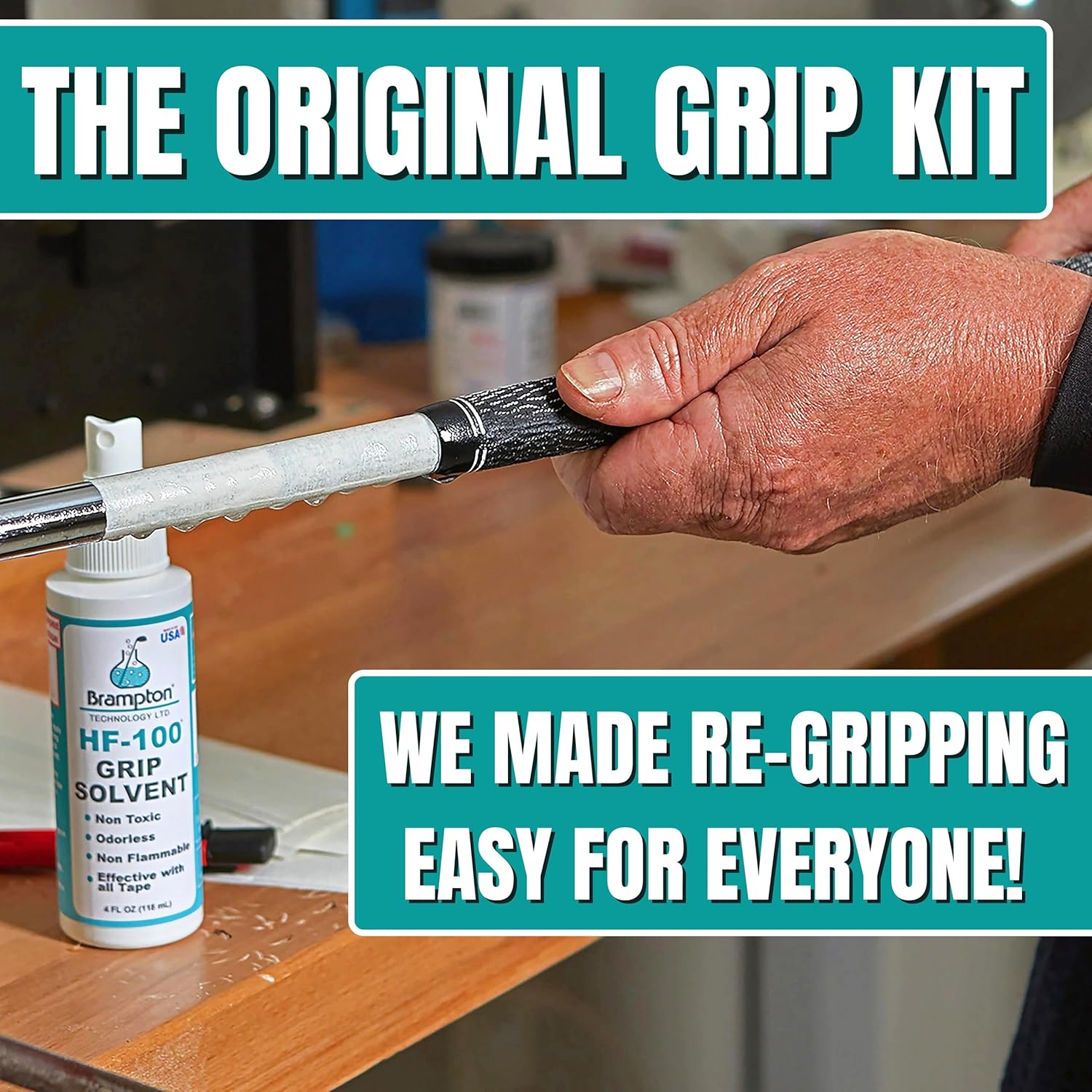 - HF-100 Golf Grip Solvent: non-flammable, non-irritating, odorless, and effective on all golf grip tapes. Our golf grip changing kit is made in the USA by Brampton Technology.