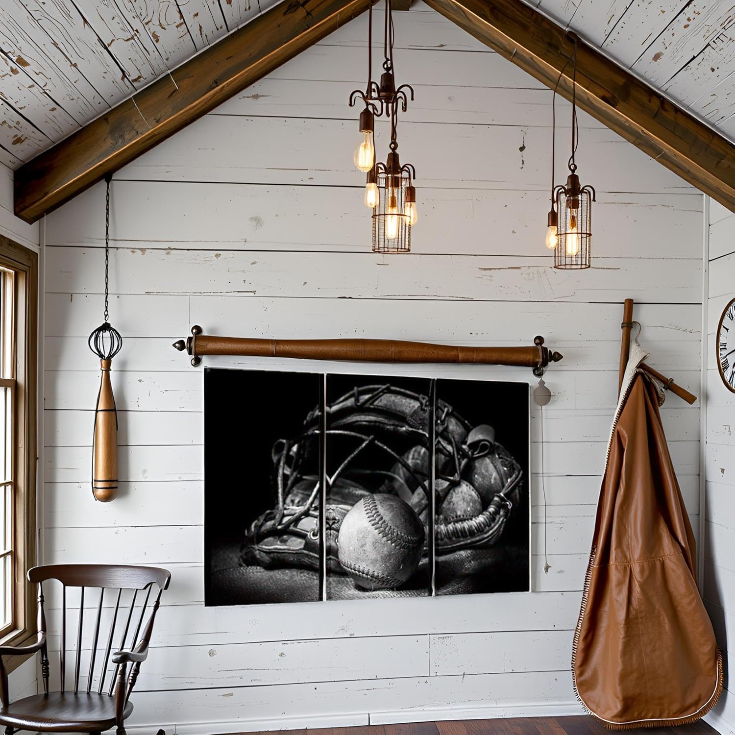 LevvArts Black and White Baseball Wall Art Sports Themed Poster Wall Decor Mens Bedroom Boys Room Decorations Vintage Ball Glove Pictures Print Home Gym Decoration 16"x32"x3PCS
