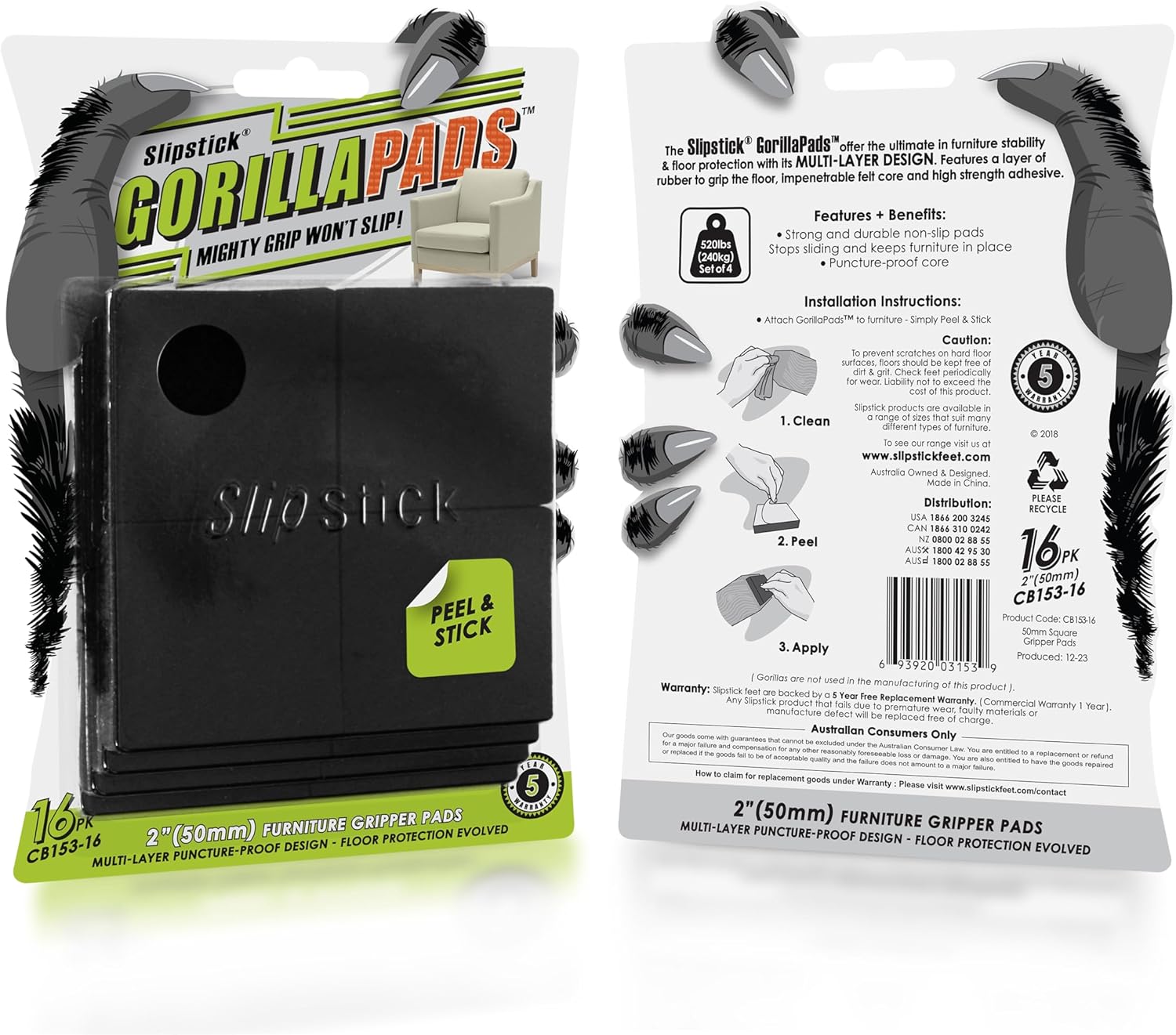 - Mighty grip that won’t slip – GorillaPad furniture gripper pads by Slipstick are the universal solution to stop sliding furniture, prevent unwanted movement of furniture / objects and effectively protect all hard surfaces from scratches or damage. Includes 16 x 2 inch square non slip furniture pads.
