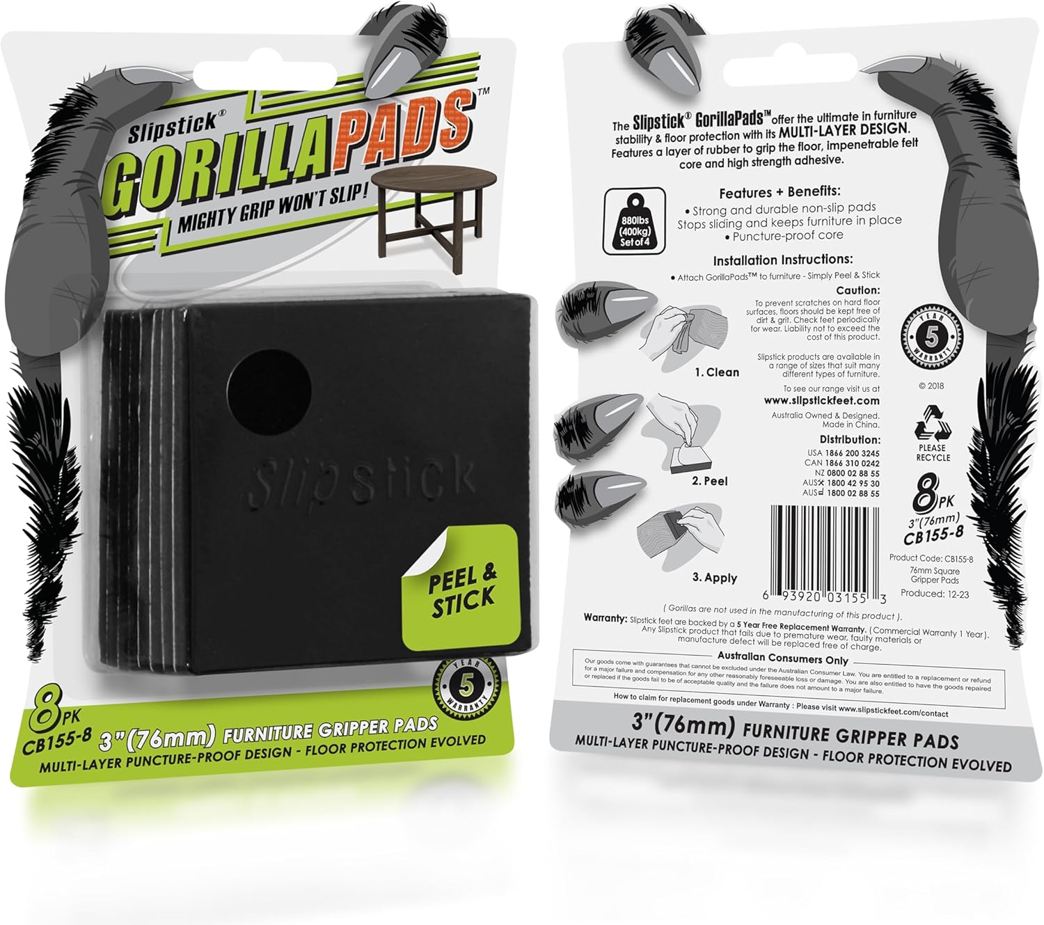 - Mighty grip that wont slip β Gorillapad furniture grippers by Slipstick are the universal solution to stop unwanted movement or sliding of furniture / objects and effectively protect hard surfaces from scratches or damage. Premium adhesive non slip furniture pads.