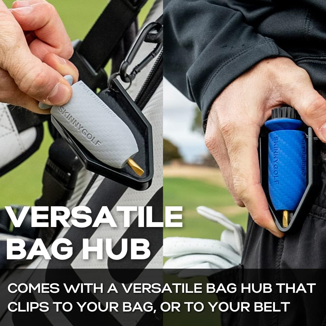 - FULLY MAGNETIC BODY & BAG HUB: Magnetic Scrub Brush attaches to metal surfaces allowing players to attach it to their club face or golf cart post. The Bag Hub is a "home" for the Magetic Scrub Brush to secure to bags or can be used as a belt clip for short game or range sessions.