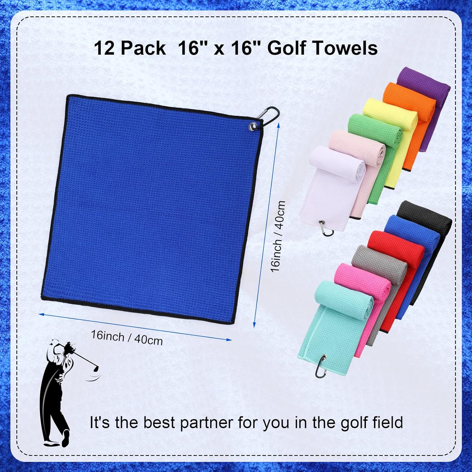 Batiyeer 12 Pcs Golf Towel Bulk for Golf Bags 16'' x 16'' Microfiber Fabric Towel with Clip Waffle Pattern, Fitness, Camping, Hiking, Yoga