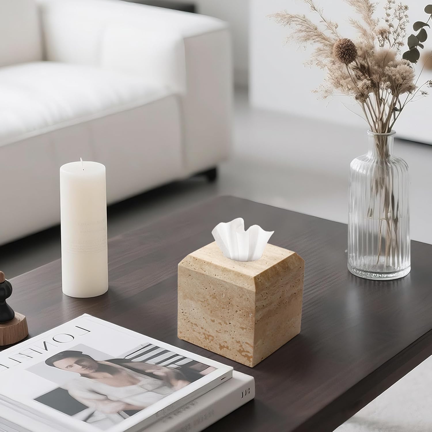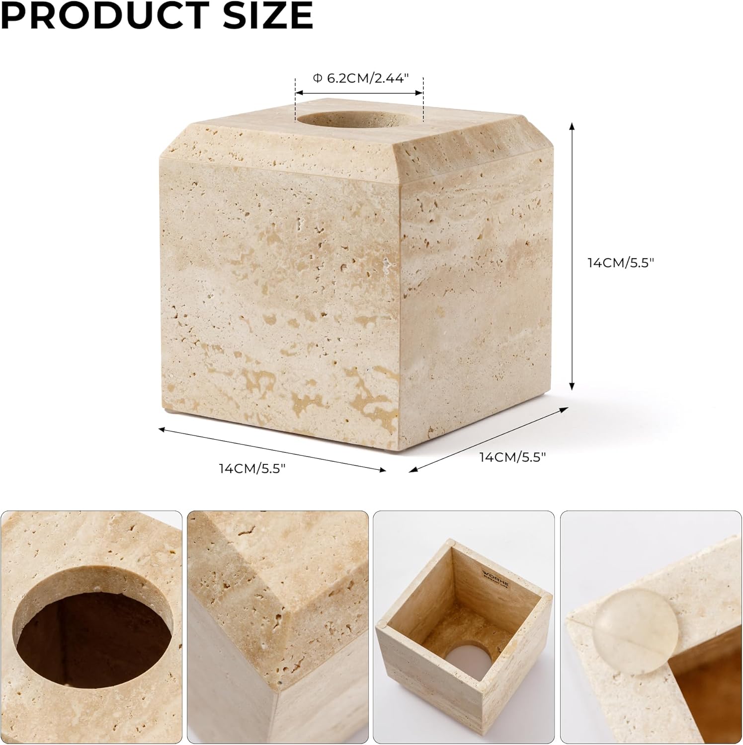 WORHE Tissue Box Cover Italy Natural Travertine Stone Heavy Duty Square Facial Toilet Paper Holder for Bathroom Living Room Bedroom Dresser Kitchen Minimalistic Office Home Decor Beige (TBC145WT)