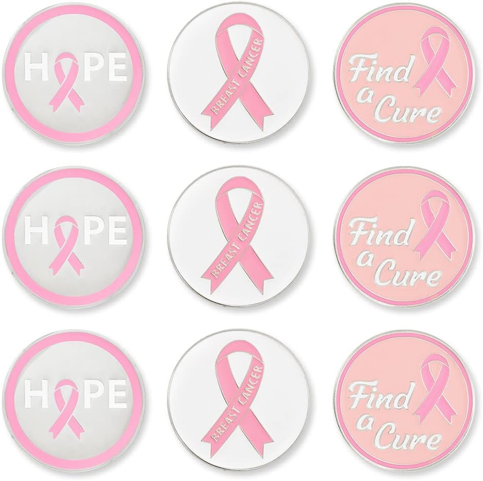 - BREAST CANCER AWARENESS: Mark your spot on the golf green and demonstrate your support for Breast Cancer Awareness by adding this ball marker 9-pack to your collection. Each marker is nickel plated and features designs like the pink ribbon