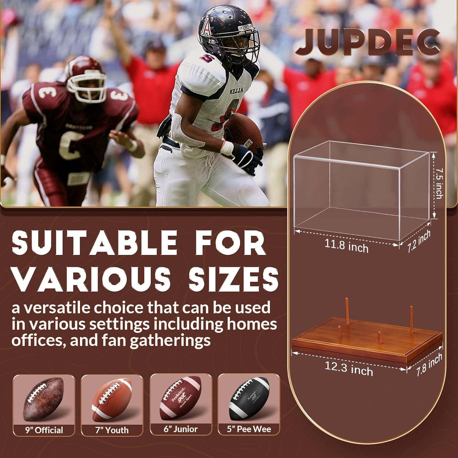 - Effortless Setup, Endless Enjoyment - The JupDec football display box makes showcasing your favorite football simple and enjoyable. Just insert the wooden rods into the base, place your football, and attach the clear acrylic cover. Whether itβs an autographed treasure or a game-day keepsake, you can easily swap out your memorabilia to keep your display vibrant and meaningful.