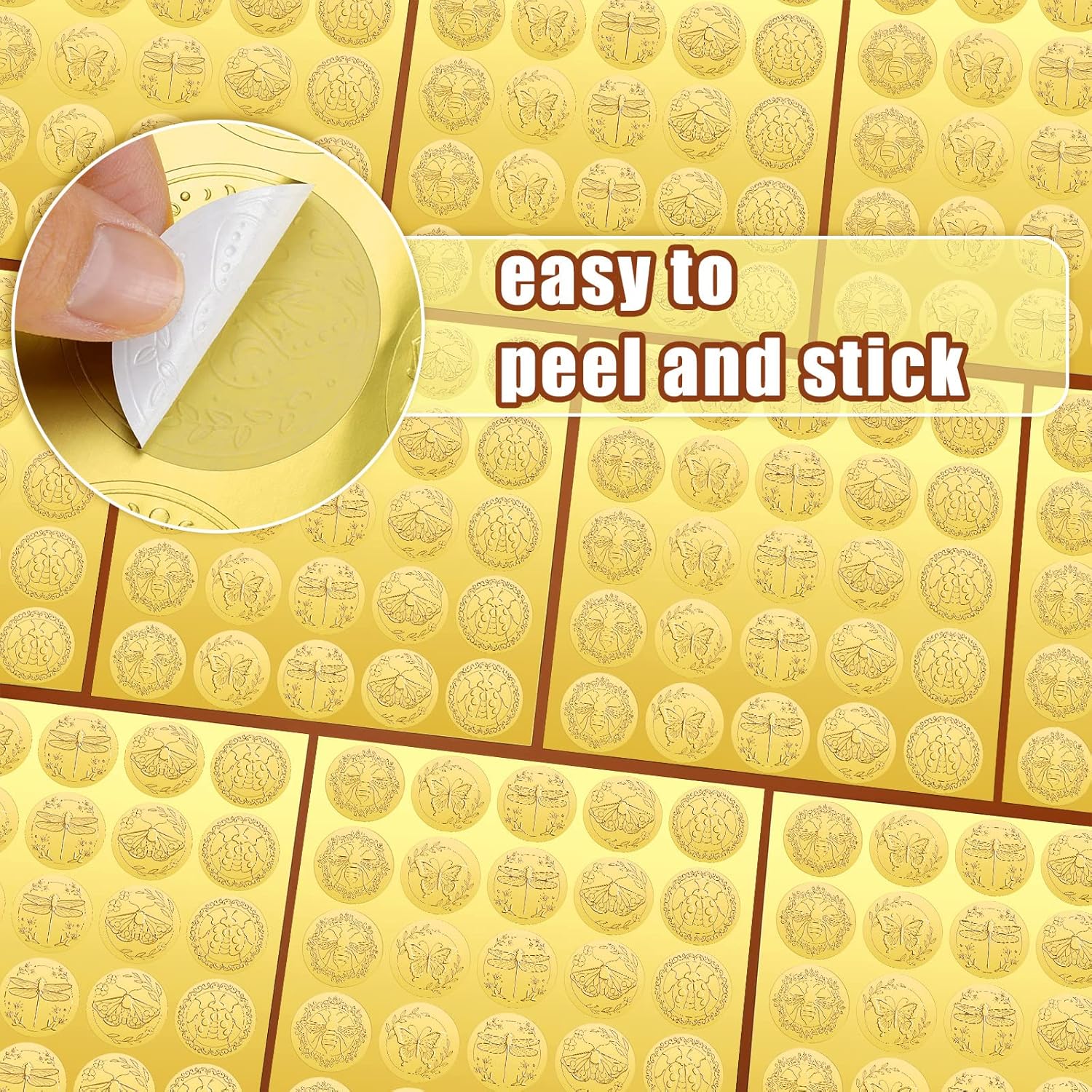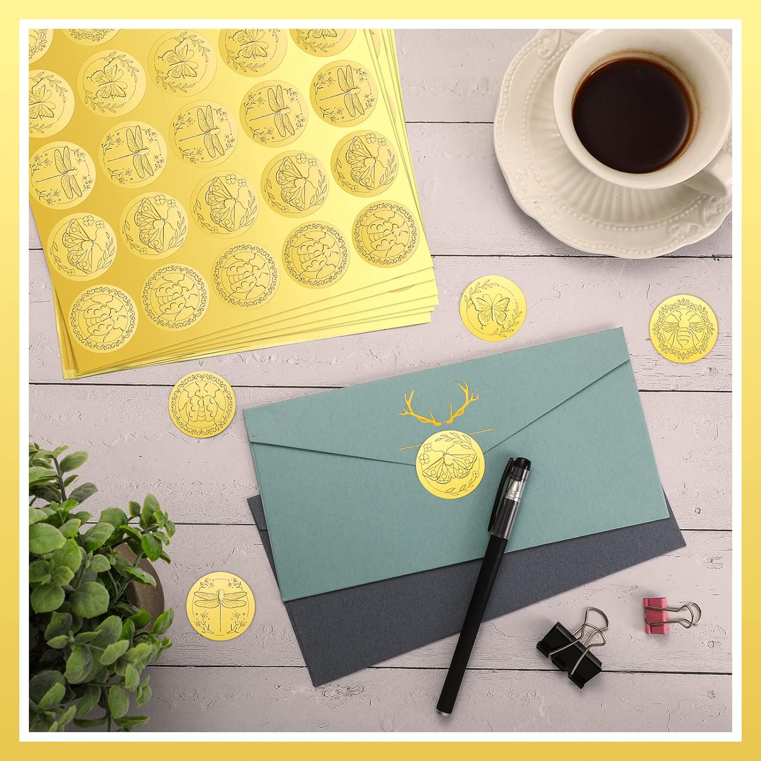 Chinco 500 Pieces Gold Embossed Envelope Seals Stickers Adhesive Seal Stickers Vintage Embossed Foil Certificate Kit Plant DIY Labels for Wedding Invitations Envelopes, 5 Patterns(Insect Style)