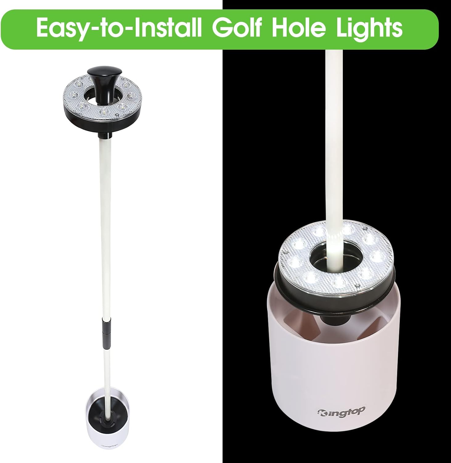 - Golf Anytime- It improves your golfing loyalty by adding KINGTOP LED hole lights and flagstick combo to your backyard putting green, bringing you so much fun at night. Don't let darkness limit your fun forever!