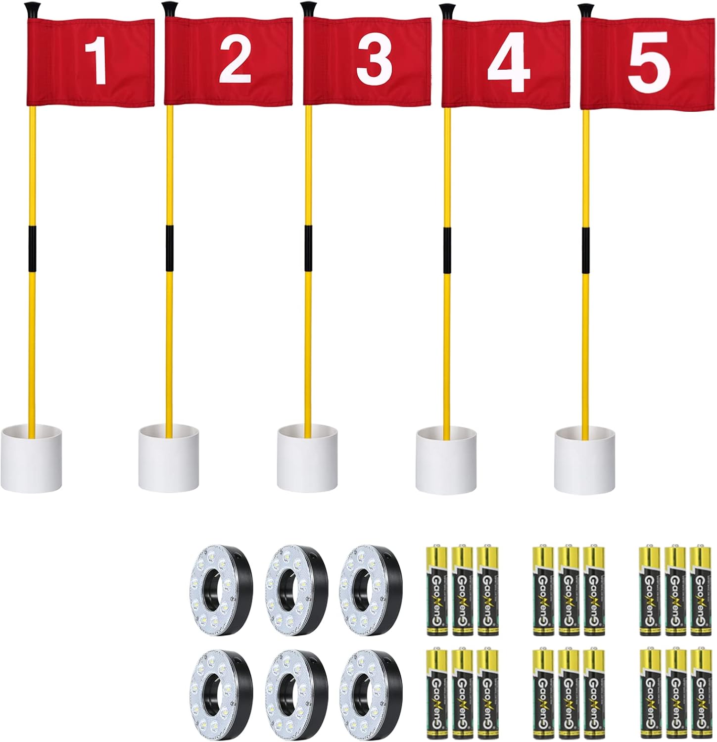 - Combo Pack- It comes with 5 mini golf flagstick sets and 6 LED golf hole lights, lighting up your backyard putting green hole for the whole night, and giving a cool white glow that lasts for 16-18 hours with a simple on-off switch.