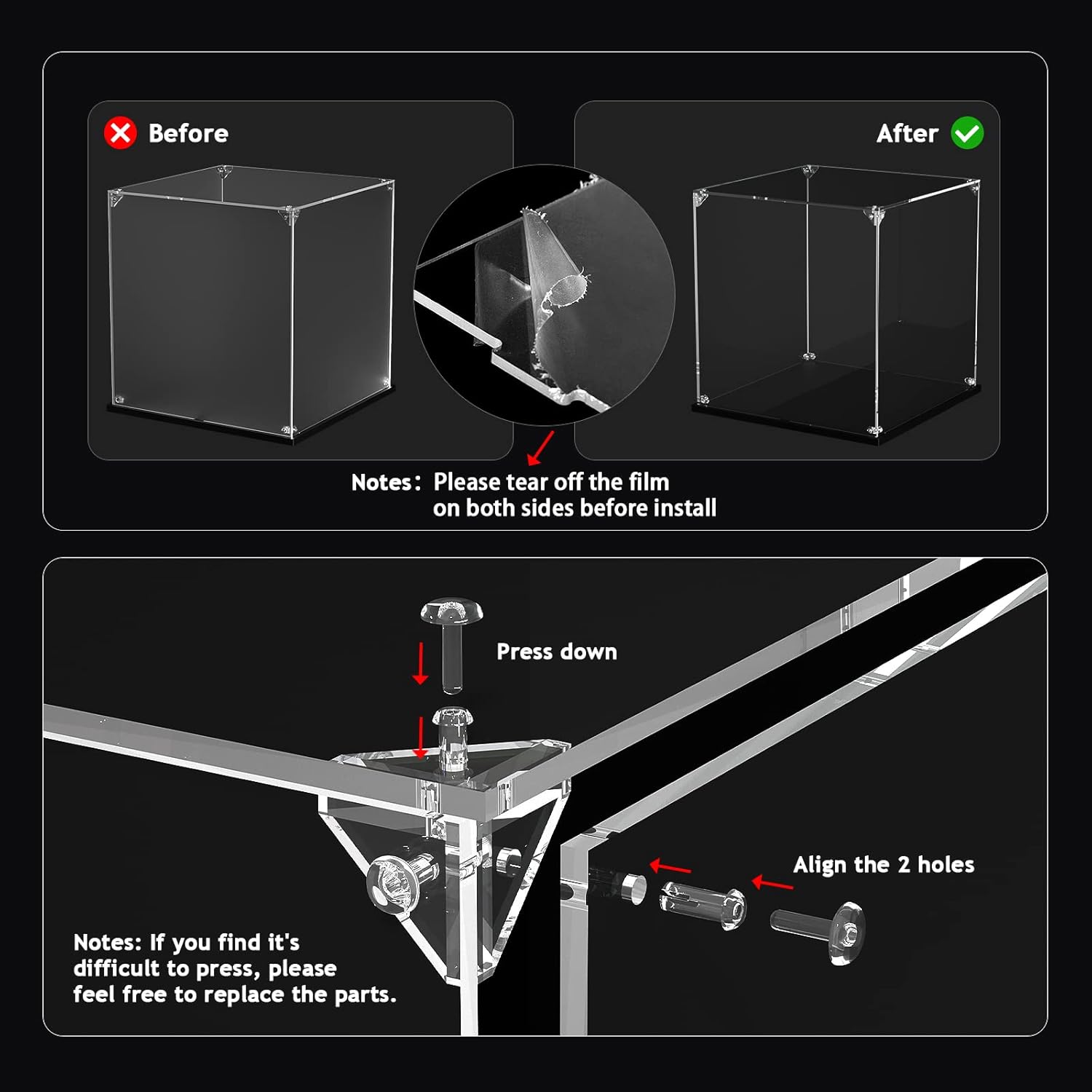 - 【Size】Interior size: 14(L)x 14(W)x 14(H) inch, 35x35x35 cm. Our display case comes in a variety of sizes, making it the perfect fit for any item you want to display. From small trinkets to larger memorabilia, our clear Acrylic Display Case can accommodate it all. NOTE: please tear off the protective film on both sides before install