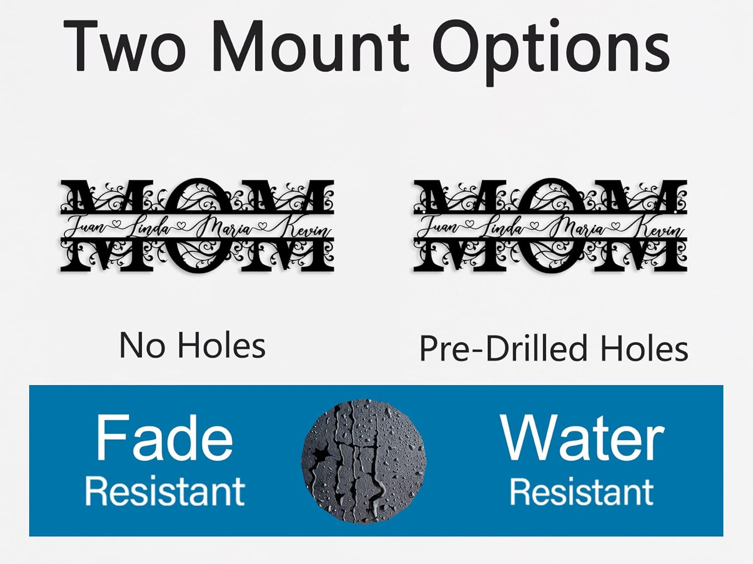- Premium Quality Materials: We cut your personalized Mom Metal Sign with the top of the line laser technology to provide precise cuts and design! We powder coat each custom metal sign to give your sign a smooth and durable finish. It is waterproof and rustproof, so it does not rust or fade with time. It will not flex nor break , Moreover, the metal sign is lightweight and is less prone to damage walls.