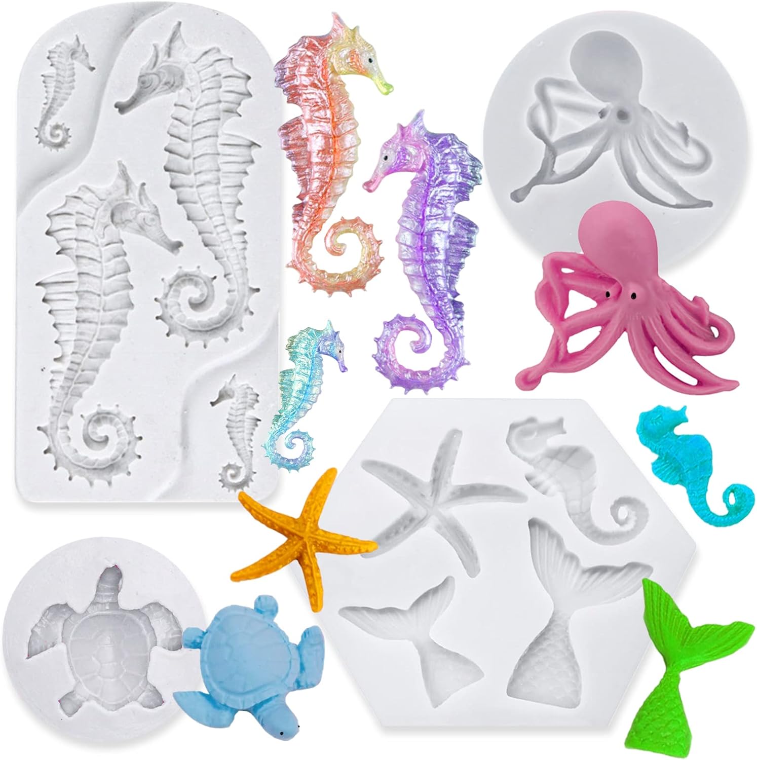 - 【More product styles】 4 marine-themed silicone molds of different sizes, 2 hippocampus molds, 1 octopus, 1 turtle