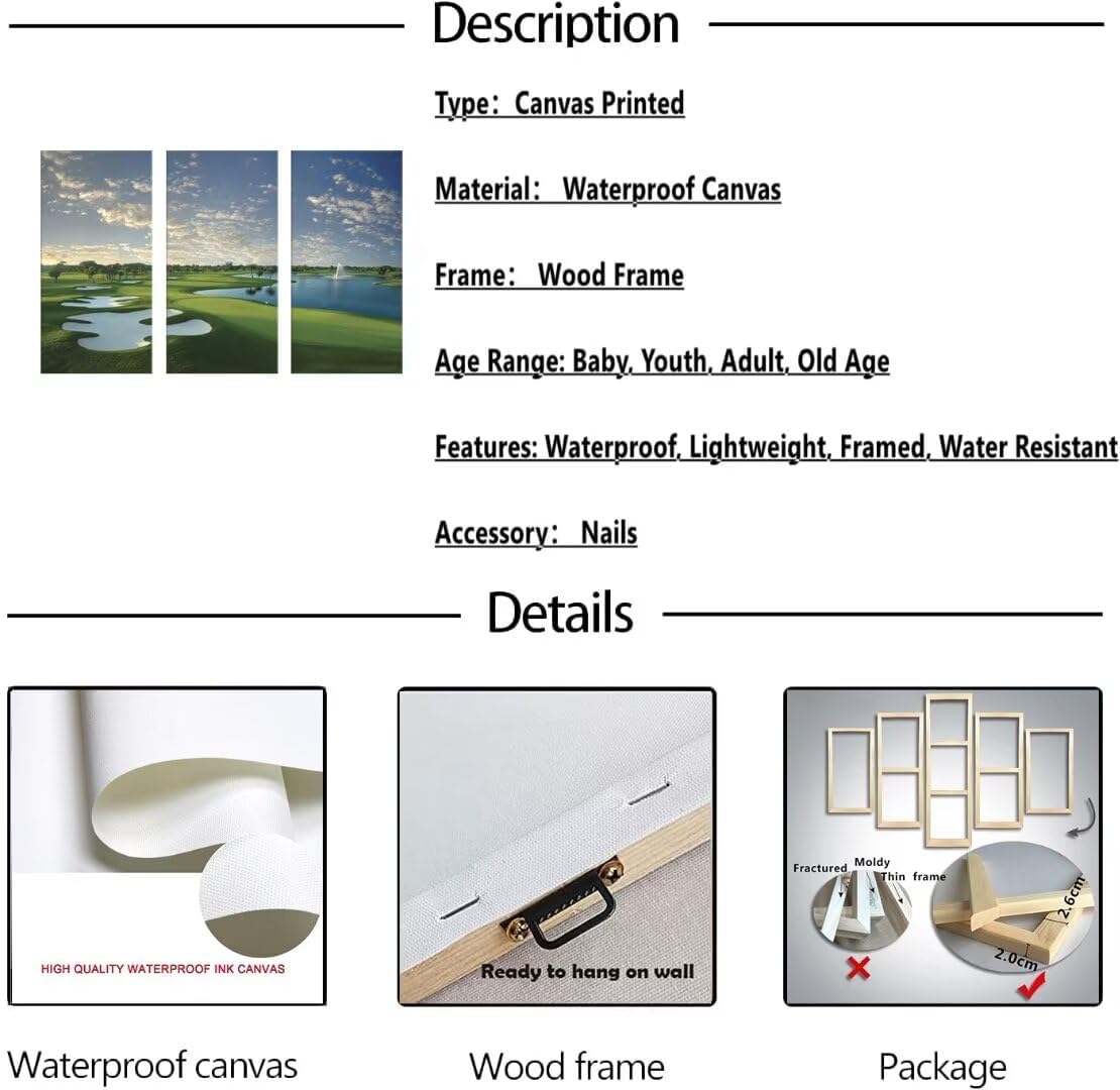 - 💝Golf course wall art size: 20''W x 40''Hx3, golf artwork canvas prints will easy to hang, and decor your room better.