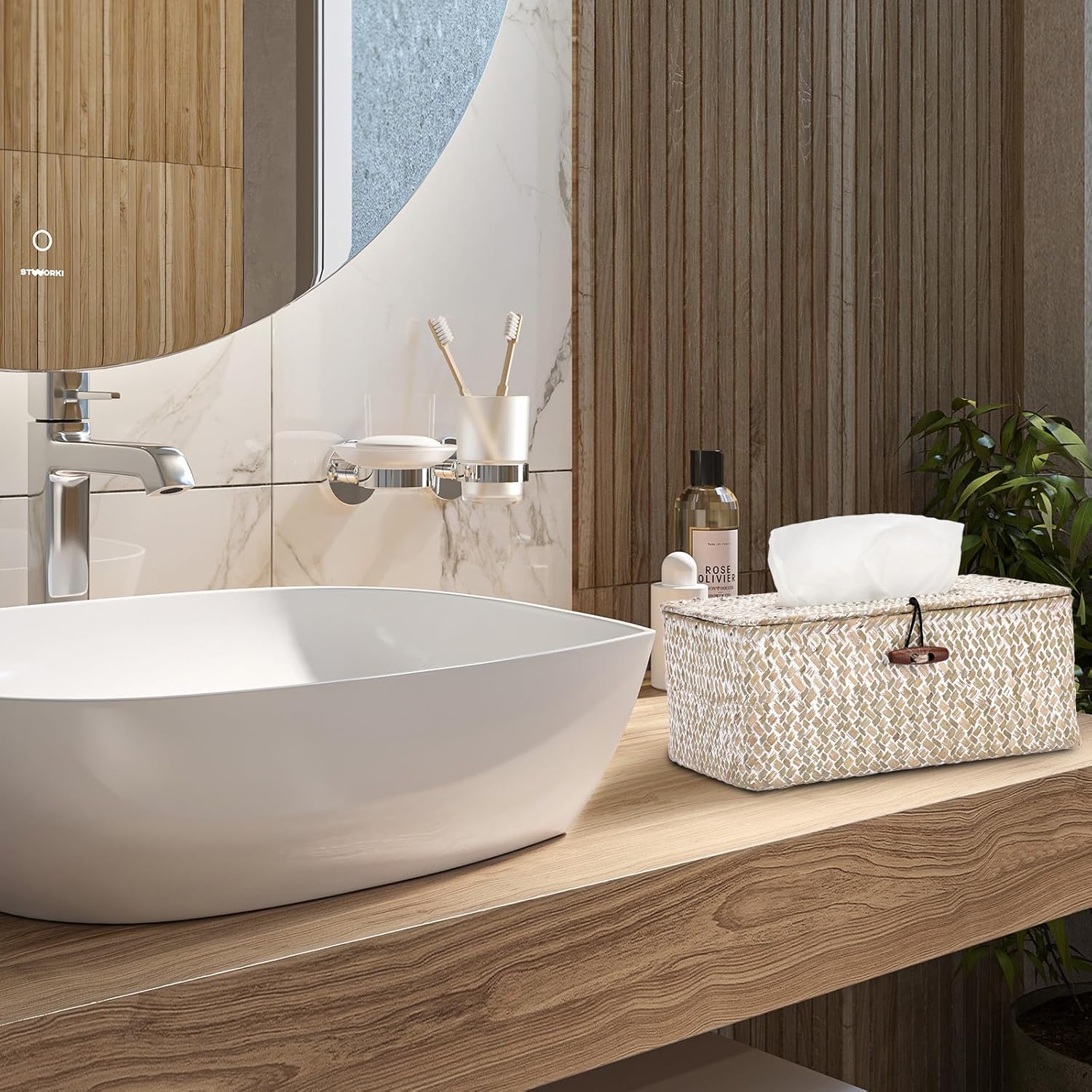 Sumnacon Rectangle Natural Seagrass Tissue Box Cover,Woven Tissue Box with Bottom,Farmhouse Tissue Box Holder for Living Room Bathroom Vanity Toilet Table Desk Countertop Office Car,Whitewash