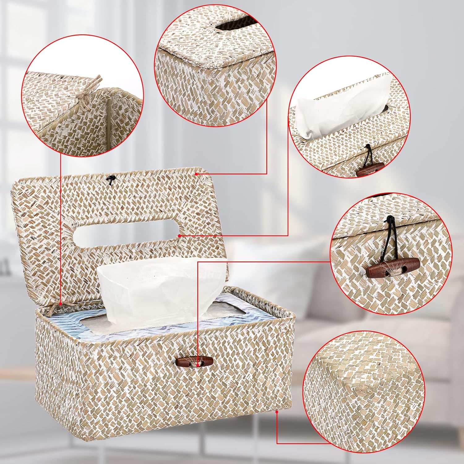 - Elastic Buckle Design - The woven tissue box holder is designed with elastic loop buckle as the closure, it's convenient for you to add or remove tissues and secured shut to keep the tissues safely inside, so you can take the tissue box cover just with one hand and go anywhere in the house without worrying about the inside tissue box falling out.