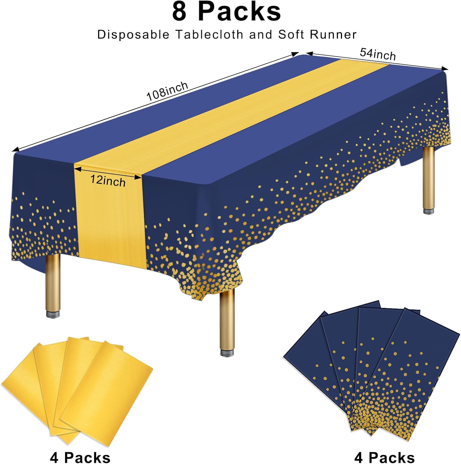 - Package Includes: 4 pieces blue table cloth and 4 pieces gold table runner, the size of the table cloths rectangle table is 54 x 108 Inch, the table runners is 12 x 108 Inch, the tablecloth set is suitable for a table that seats 10-12 people.