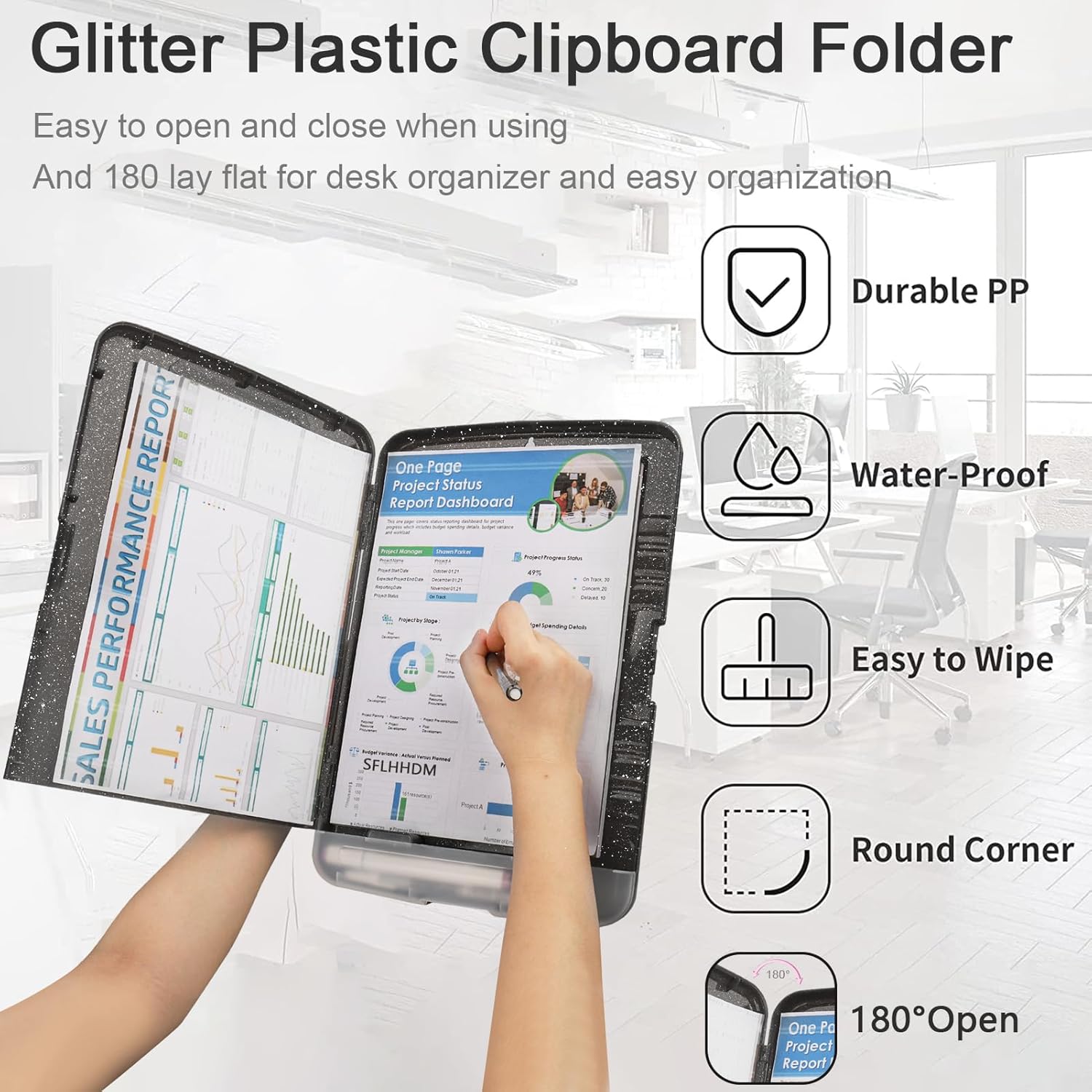 - Glitter Design: Clip boards 8.5x11 with storage have a bright color, Classic and chic glitter elements make this colorful clip boards more attractive. The ergonomic design of the grip is non-slip and comfortable. With this unique clipboard, your daily works are far more fun and easy