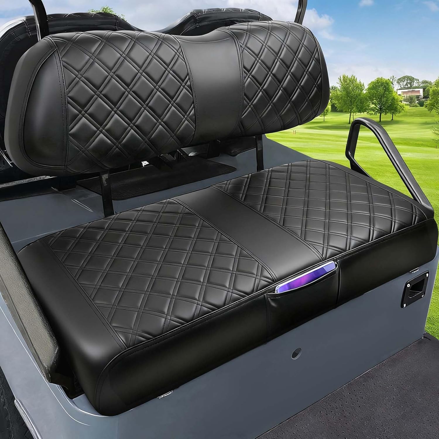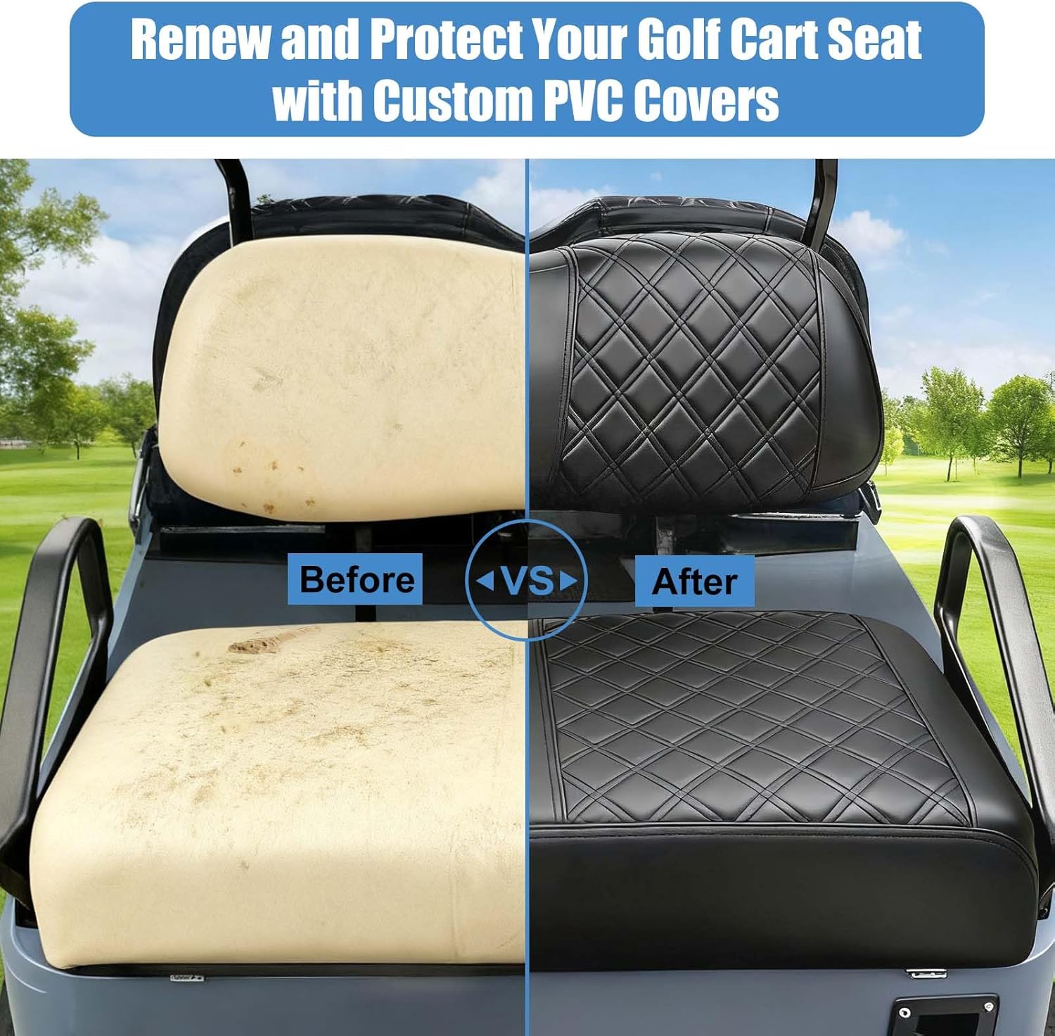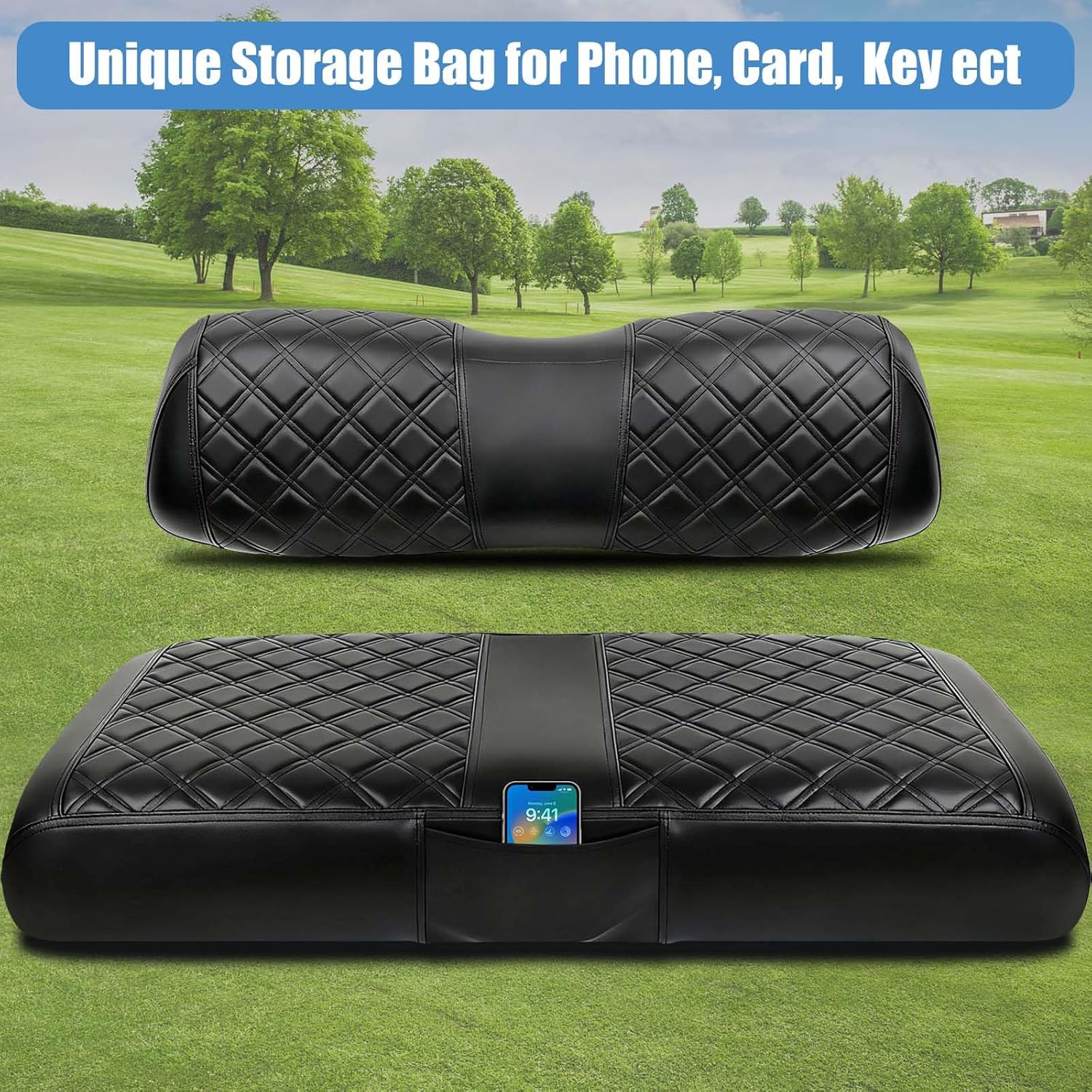 - ✅Upgrade Design: ①Smooth vinyl PVC leather material and black color make it easy to clean and dirty resistance. ②Small pocket for storing keys, cards, Phone etc. ③Square concave and convex design appearance makes your golf cart brand new and fashion.