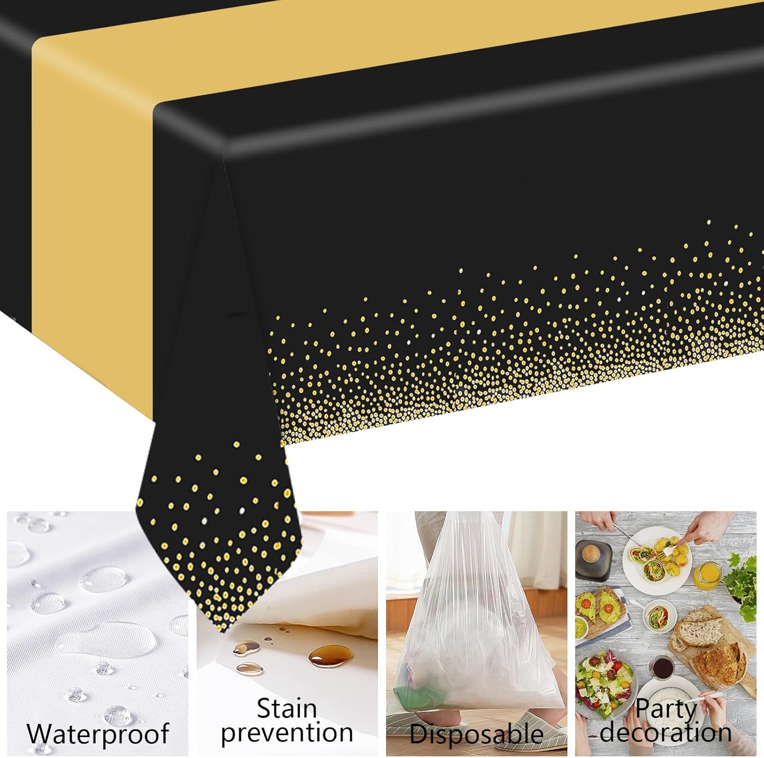 6 Pack Rectangle Plastic Dot Tablecloth Set, 54 X 108 Inch Plastic Table Cover, 12 x 108 Inch Satin Table Runners for Wedding Graduation Birthday New Year Party Decorations (Black, Gold)