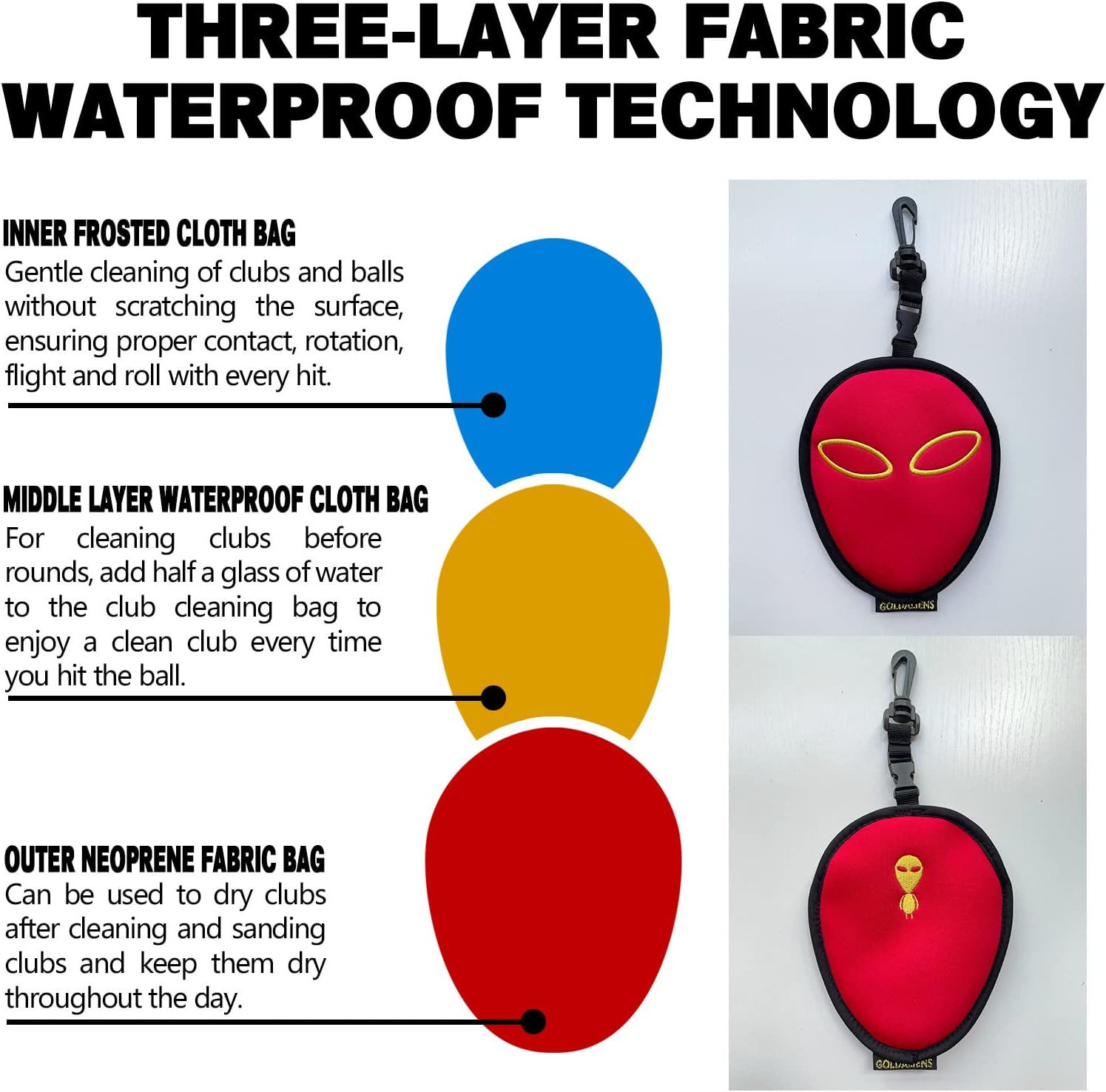 - 【MIDDLE LAYER WATERPROOF CLOTH BAG】:For cleaning clubs before rounds, add half a glass of water to the club cleaning bag to enjoy a clean club every time you hit the ball