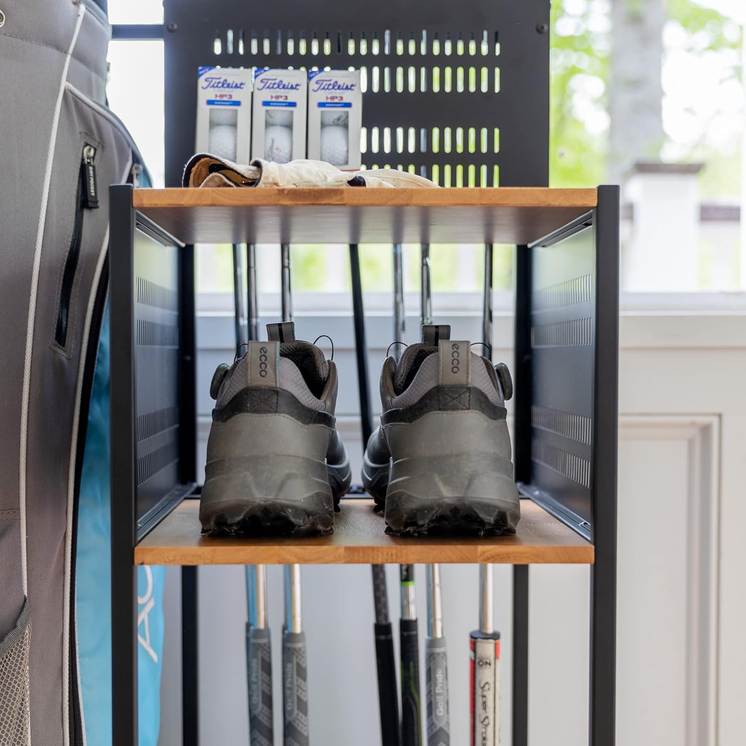 - Ultimate All-in-One Golf Storage Organizer: Take your golf gear organization to the next level with our multifunctional golf bag organizer. This spacious and efficient rack neatly holds your golf bags, clubs, balls, shoes, and gloves. Everything you need for a day on the course. Whether you're storing gear in your garage, home, basement, or golf club, this unit keeps everything in one easy-to-access place, reducing clutter and saving space.
