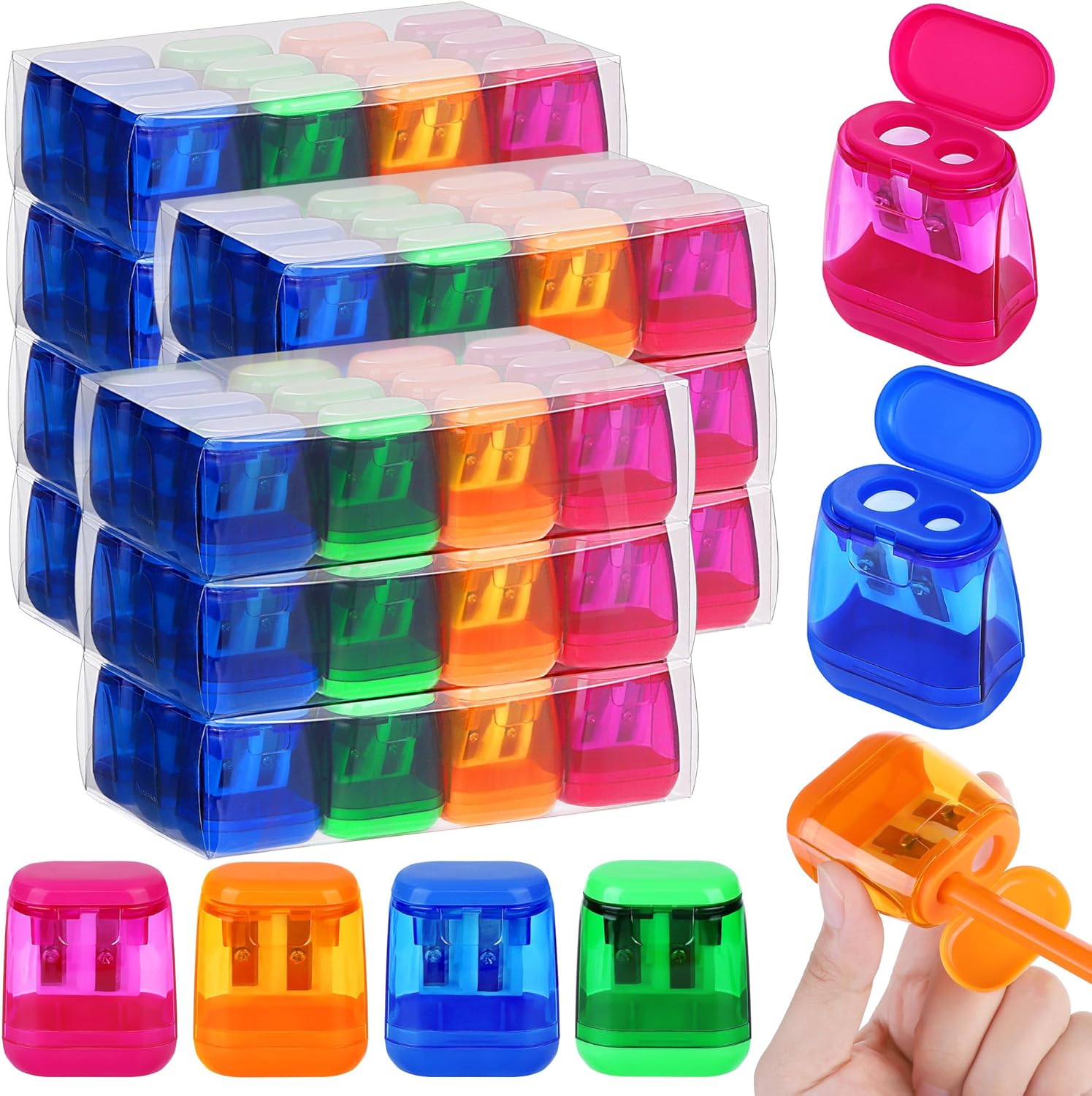Aodaer 96 Pieces Manual Pencil Sharpeners Dual Hole Compact Sharpener with Lid for Kids Pencil Sharpener in School, Office, Home Mixed 4 Colors