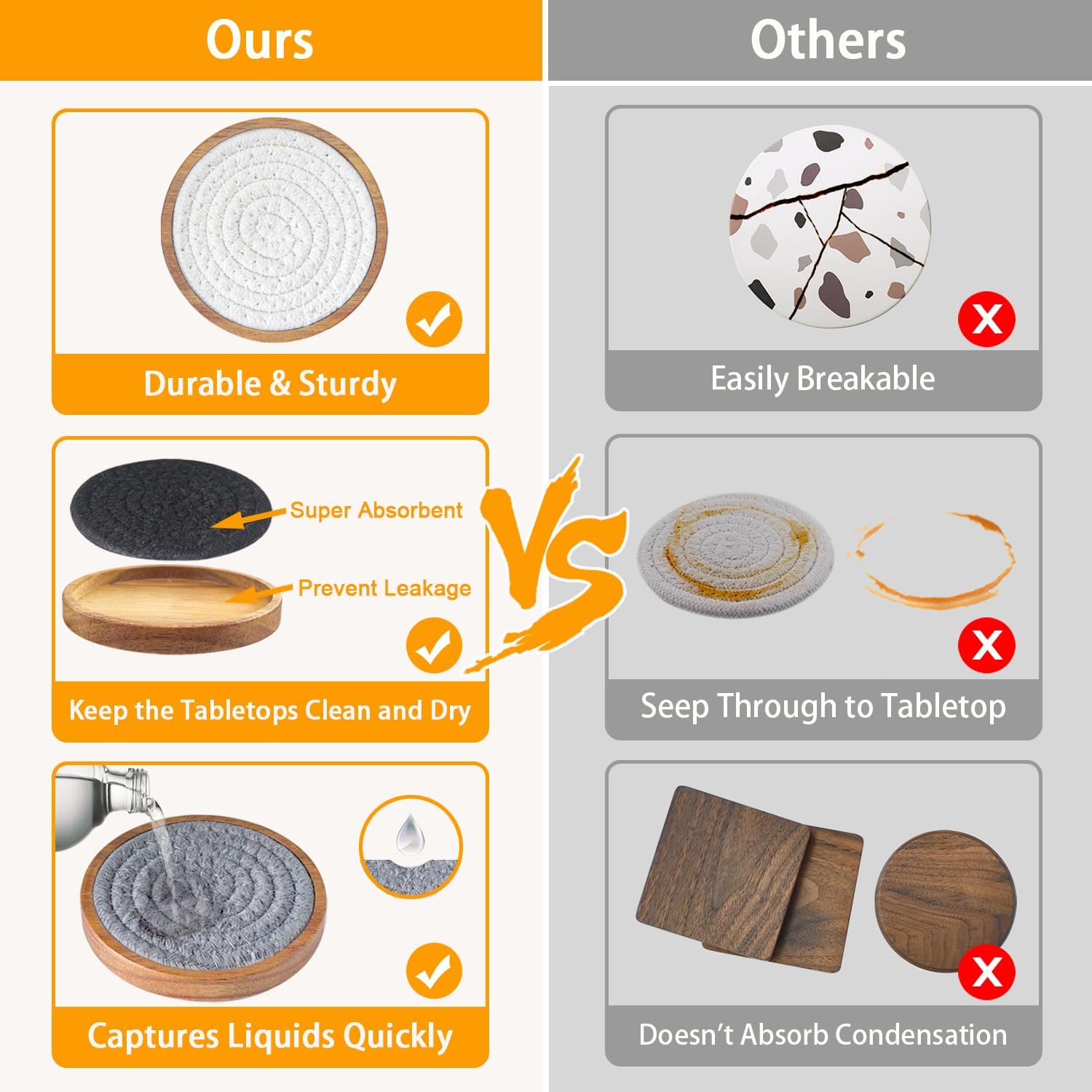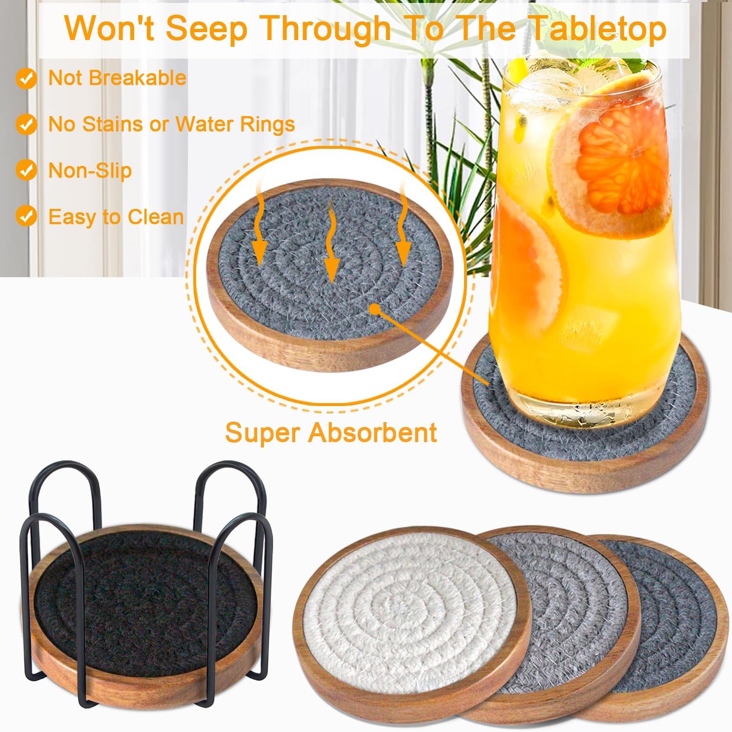 - 【Coasters with Holder】: Original Design & Patented Product, super absorbent coaster set comes with a practical metal holder for easy storage; the coasters are woven inserts and wooden base construction that can absorb a larger amount of condensation and ensure moisture does not permeate on the table, keep the table dry to prevent stains or water rings.