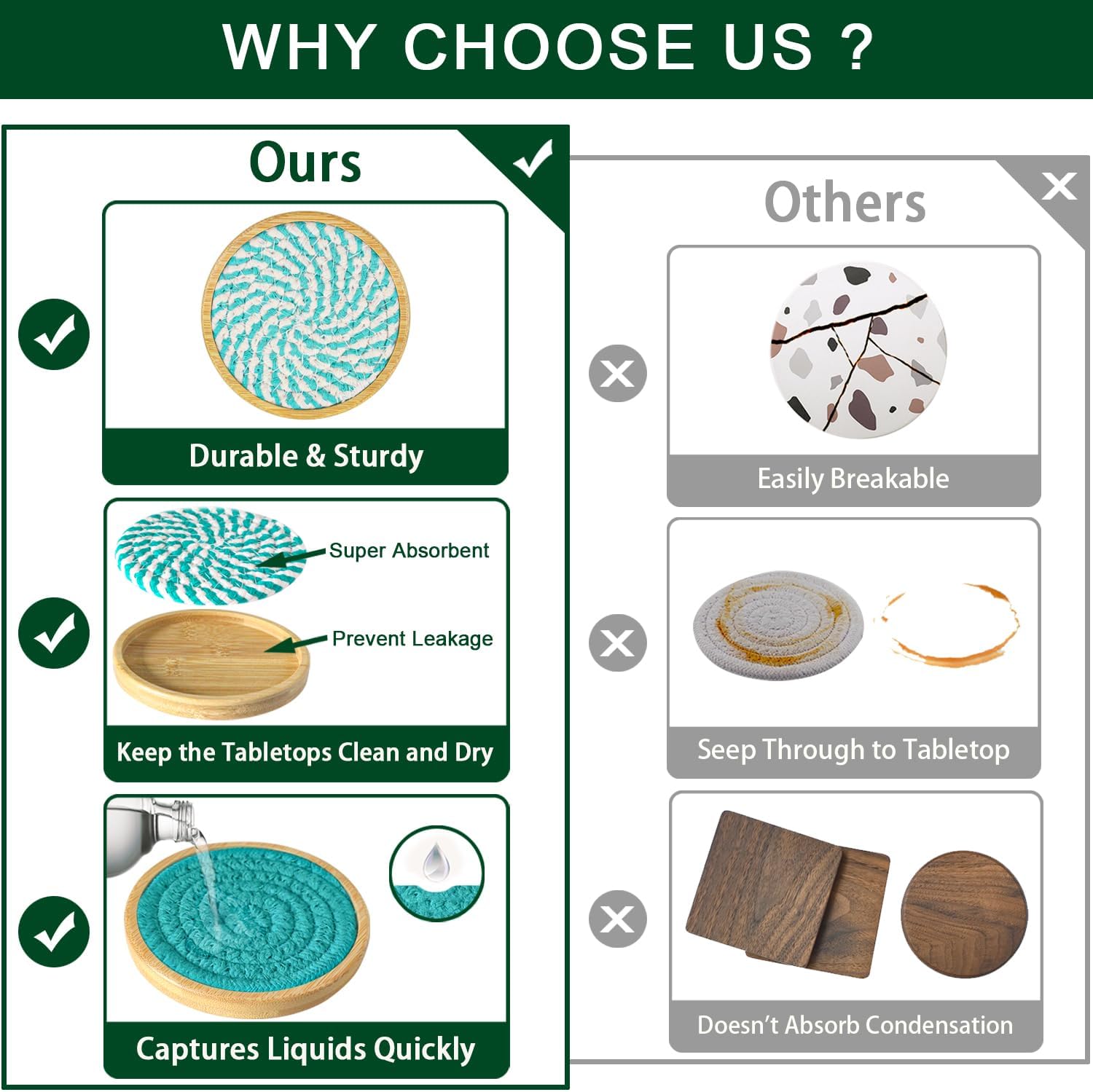 - 🍺Coasters for Drinks Absorbent: Original Design & Patented Product, the coasters are woven inserts and bamboo wooden base construction that can absorb a larger amount of condensation and ensure moisture does not permeate on the table, keep the table dry to prevent stains or water rings.