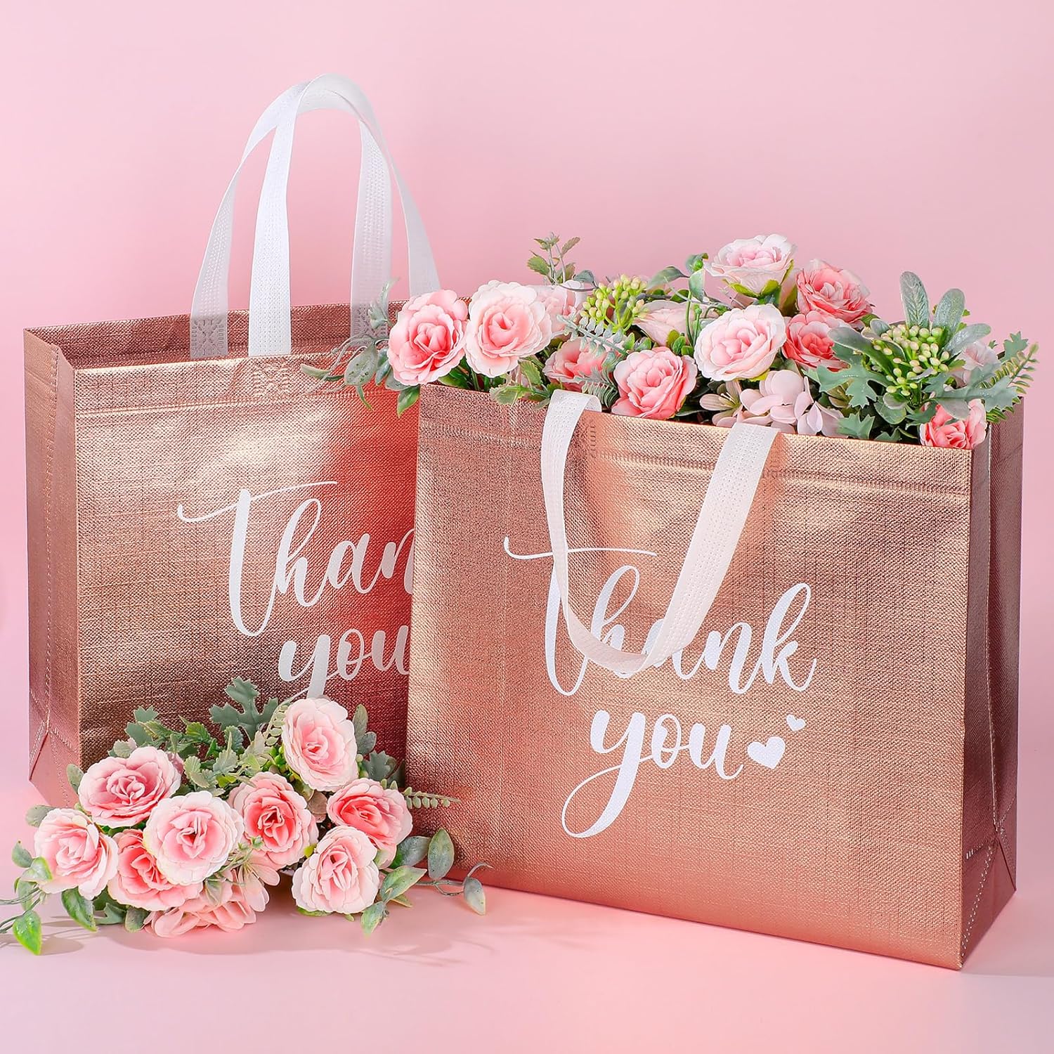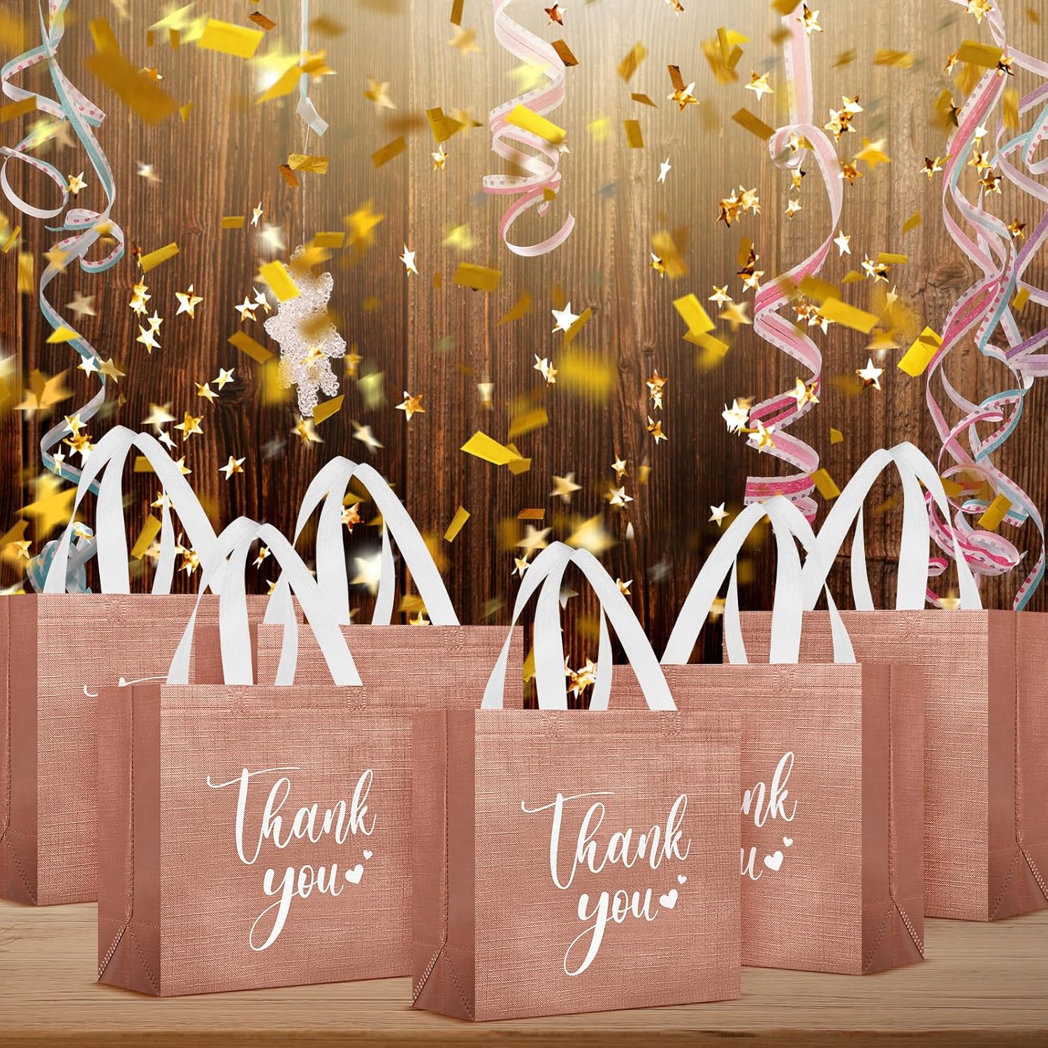 - Applicable for Parties and Daily Life: these thank you tote non woven bags are ideal for weddings and bridal showers, also suitable for birthday parties, baby showers, Thanksgiving, graduation ceremonies, afternoon tea parties, business banquets and other occasions; There is a large enough capacity to hold gifts, jewelry, lipstick, souvenirs, toys, clothes, snacks, candy and more, providing you and your guests with a wonderful party atmosphere