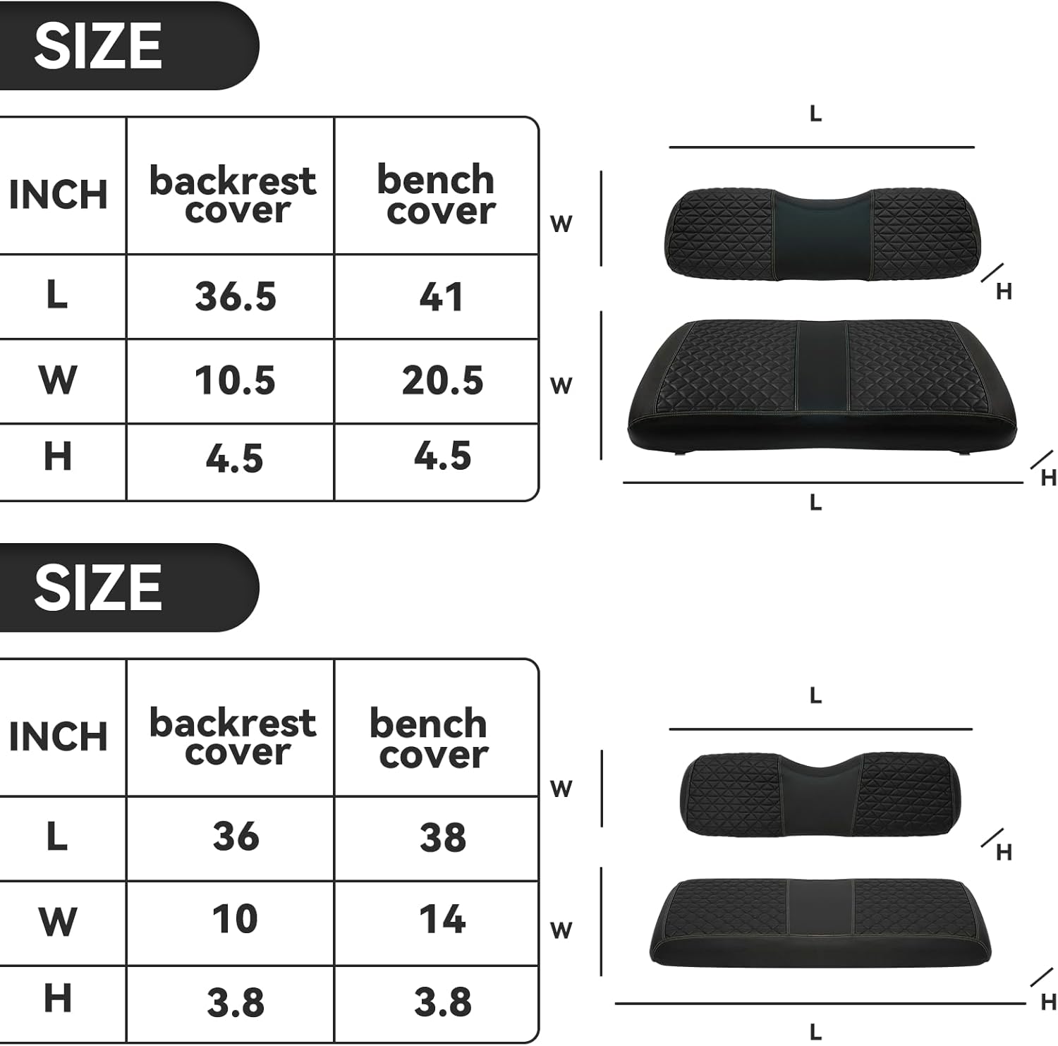 - ăApplicable VehiclesăPackage included 4pcs seat covers. Front seat covers are suitable for golf cart EZGO TXT 1994-2013 Ordinary front beach and backrest seat covers, not suitable for other shapes or OEM wide beach seat cushions and other wider backreat seat cushion, not for modified seat. Rear seat covers are only suitable for aftermarket B shaped rear seat kit Please check the size chart before ordering. There will be 1 inch differences because of manual measure