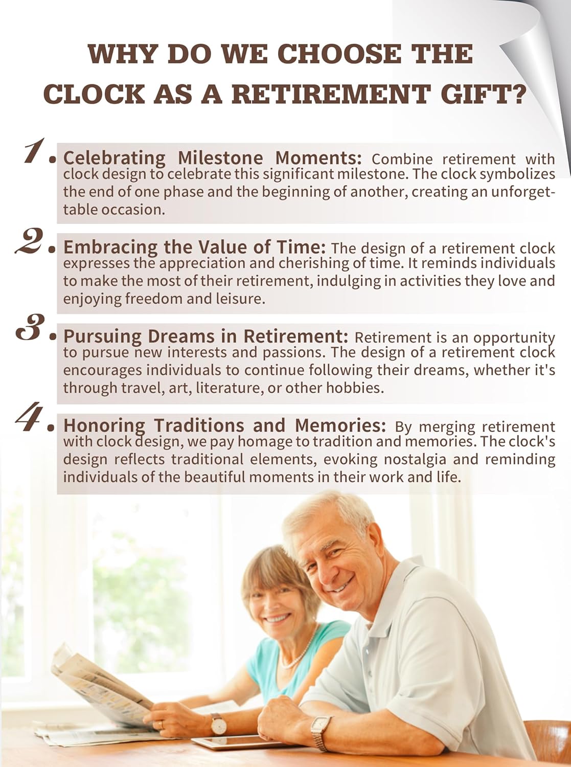 - A TESTAMENT TO PERSONAL ACHIEVEMENTS: Our retirement clock is not just a time device; it's a tribute to personal achievements. It serves as a proud memento, reminding recipients to remember their past accomplishments and appreciate the journey that shaped them into the unique individuals they are today. It is a constant reminder of their value and contributions to society, making it a cherished gift that inspires joy and happiness in their retirement years.