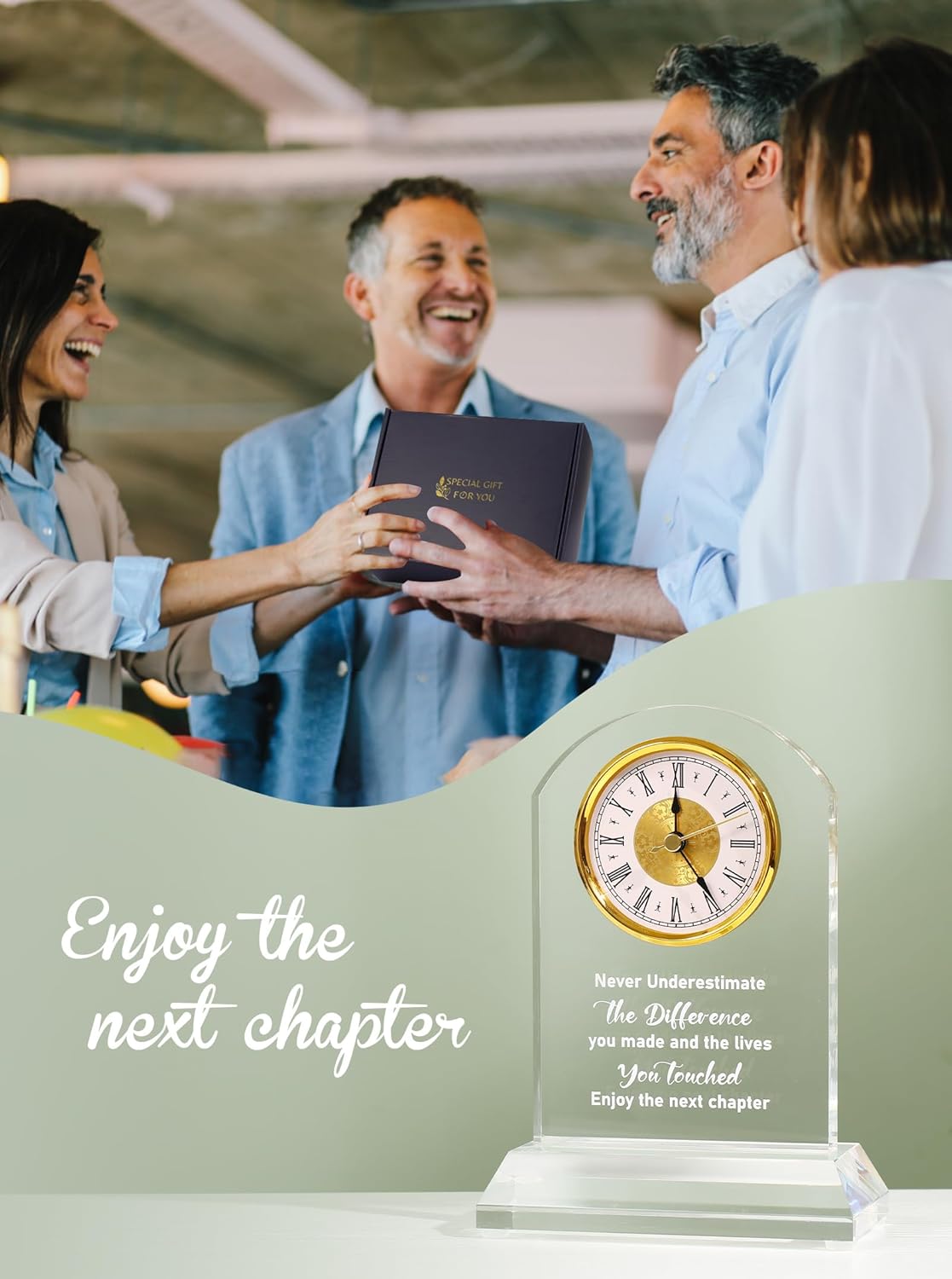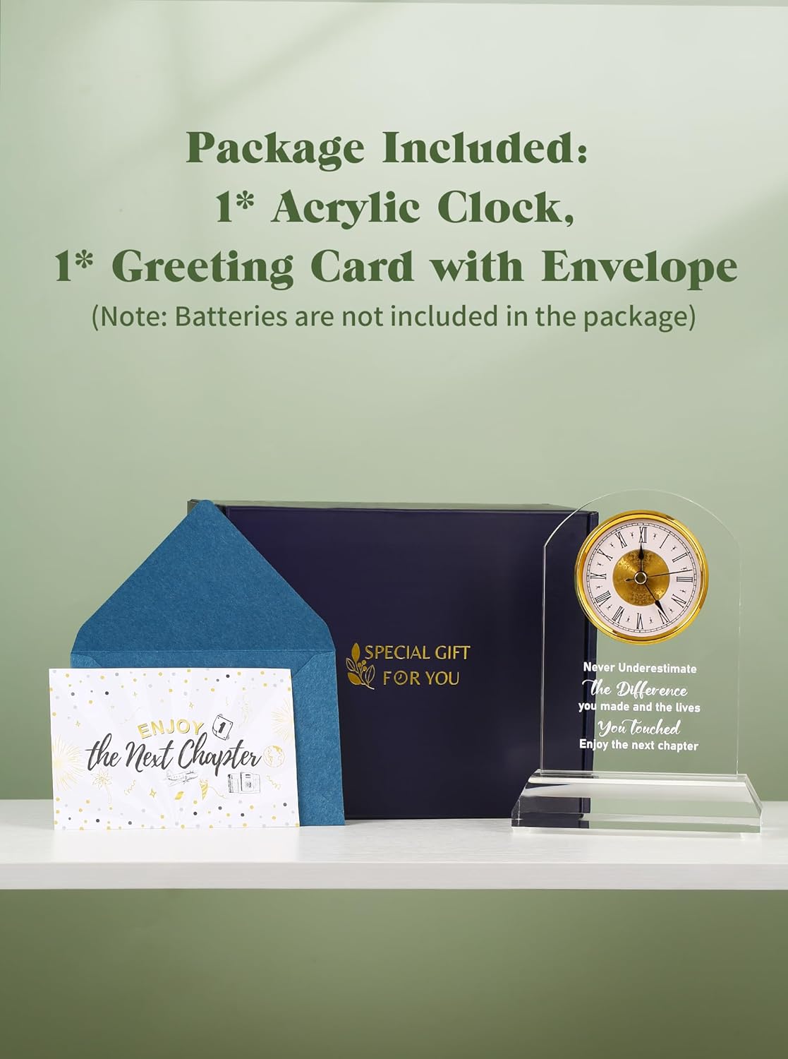 - BEST RETIREMENT OR LEAVING GIFTS: Leaving is the end of a chapter, but also the beginning of something new. Our exquisite desk clock is Crafted with premium acrylic and adorned with a clear UV-printed message, "Never Underestimate the Difference you made and the lives you touched Enjoy the next chapter," it makes an ideal retirement or farewell gift for coworkers, teachers, bosses, friends, parents, and elders. Let them know their impact is appreciated.