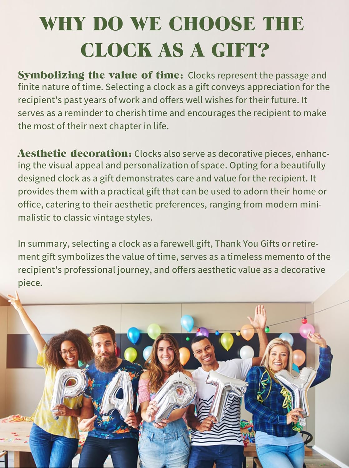 - CELEBRATE A REMARKABLE JOURNEY: Our clock represents more than just a timepiece; it's a tribute to personal achievements. It serves as a proud memento, encouraging recipients to remember their past accomplishments and appreciate the journey that shaped them into the unique individuals they are today. Let them always remember their value and contributions to society, making this clock a cherished gift that inspires joy and happiness throughout their next chapter of life.