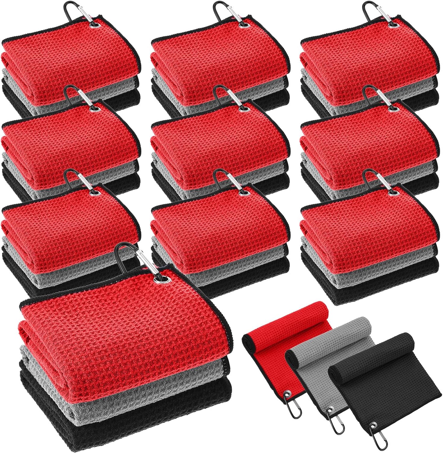 Batiyeer 30 Pcs Bulk Golf Towels for Golf Bags 16'' x 16'' Microfiber Fabric Golf Towel Waffle Pattern with Clip for Bags Men Mini Tournament Fitness Yoga Camping(Black, Gray, Red)
