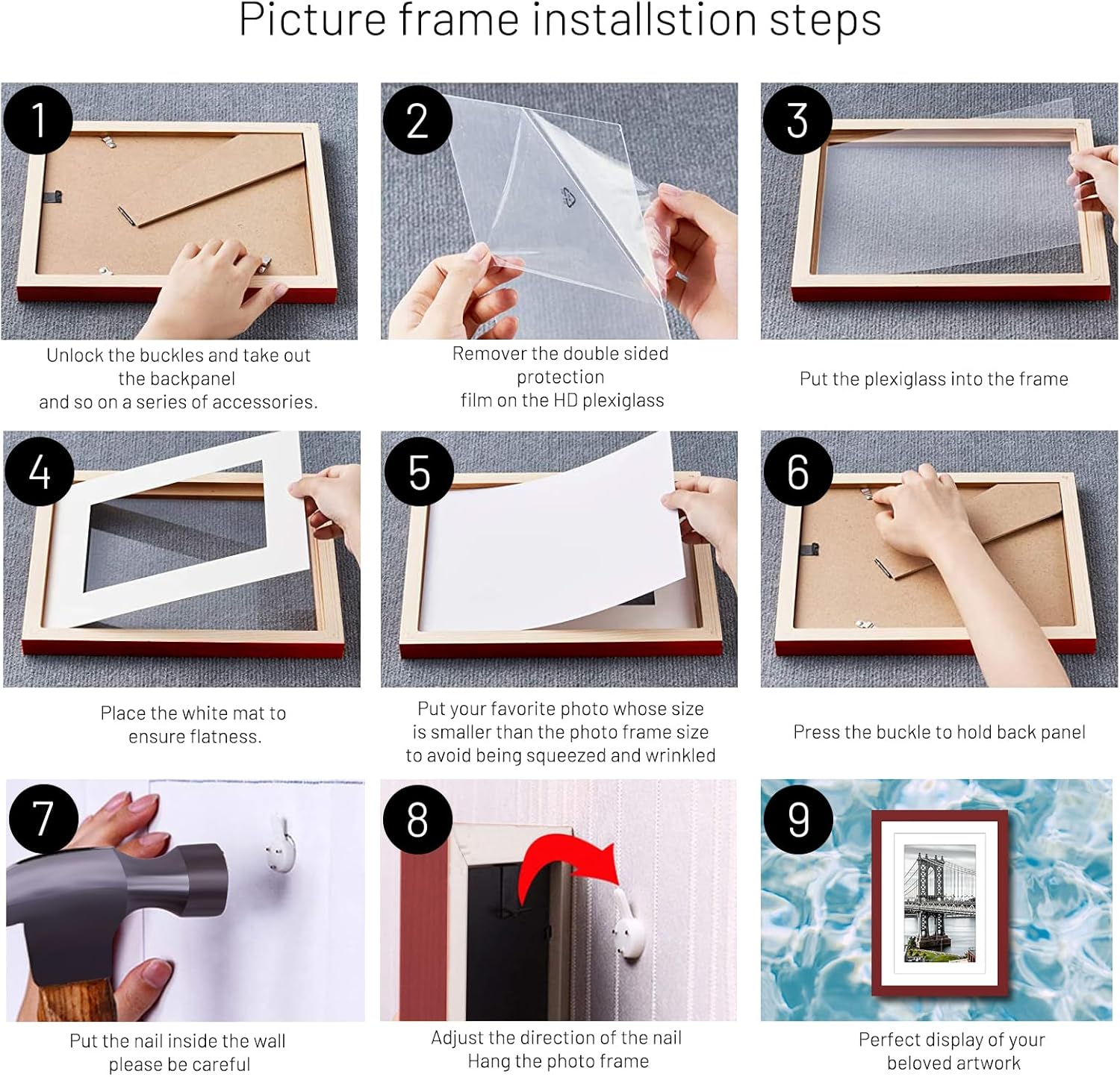 - 【MATERIALS】9x12 picture frame is made of solid pine wood to make sure amazing durability and beautiful finished look. High definition plexiglass(Hd Plastic) cover will give a clear view of your cherished picture like glass, preserve them perfectly. No worrying about injury due to accidental glass breakage (Peel protective films before use).