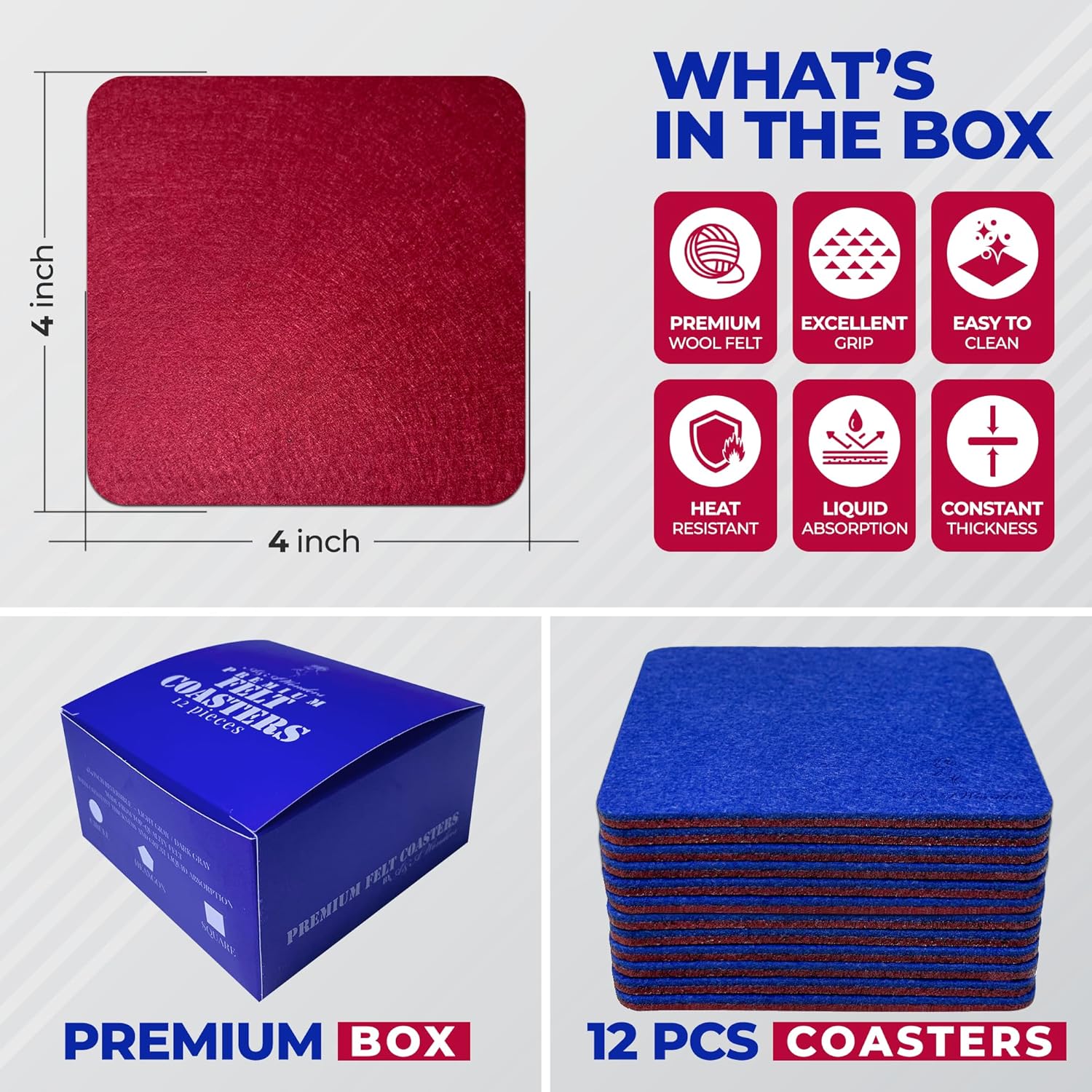A&A Wonders Premium Felt Coasters for Drink, Two-Tone Reversible, Absorbent Felt Protects Furniture, Table, Anti Slip, Suitable for Drinks & All Table Types (Wine Red/Royal Blue, Square 12 Pack)