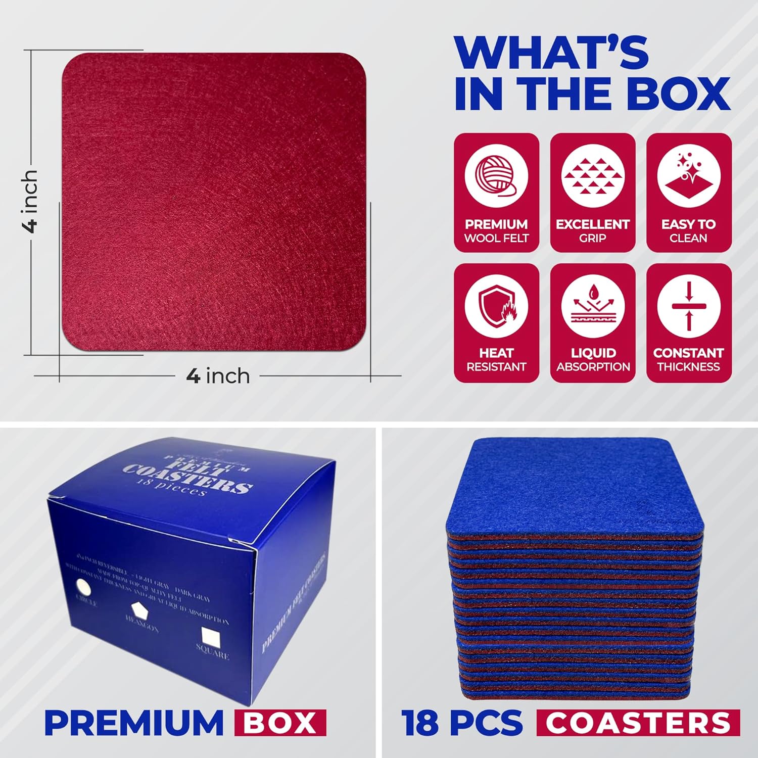 A&A Wonders Premium Felt Coasters for Drink, Two-Tone Reversible, Absorbent Felt Protects Furniture, Table, Anti Slip, Suitable for Drinks & All Table Types (Wine Red/Royal Blue, Square 18 Pack)