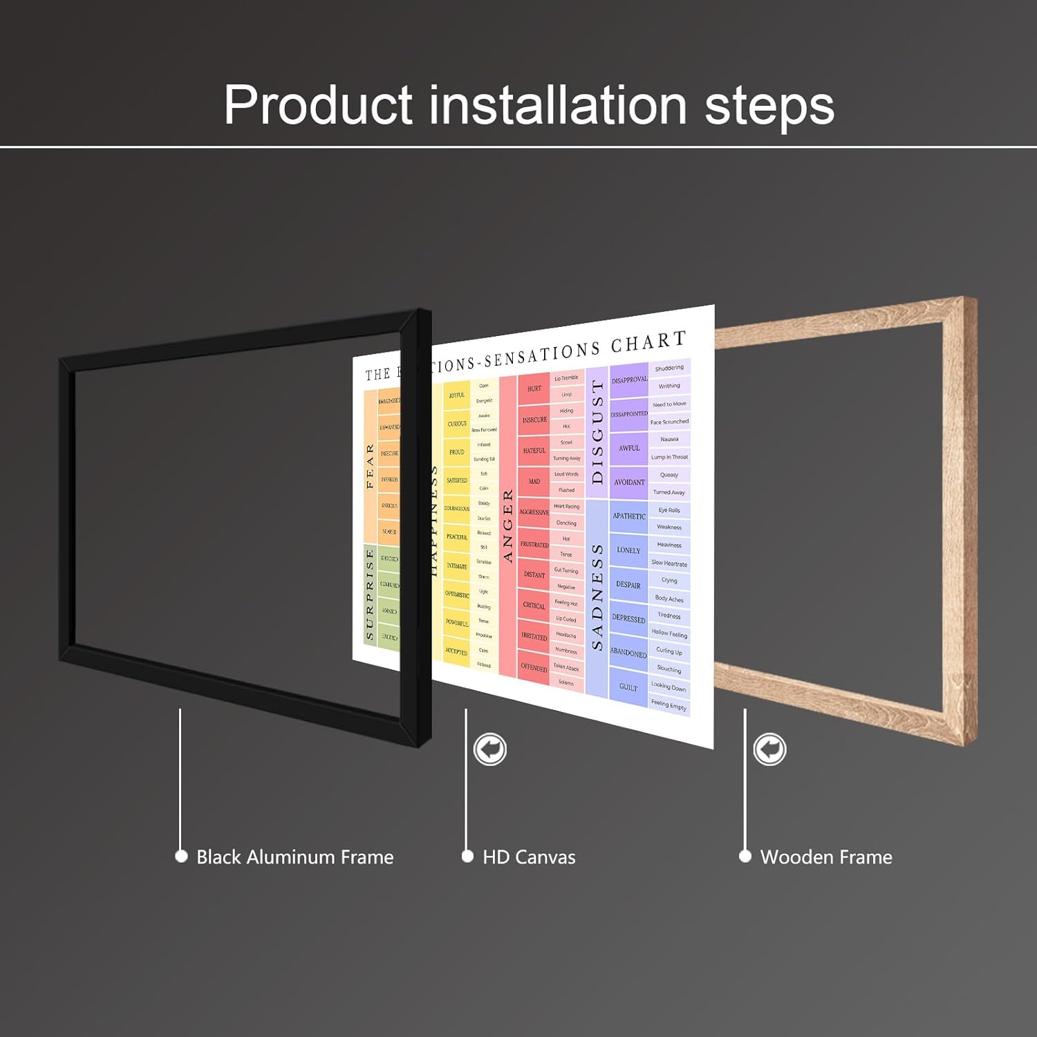 - 【Emotions Chart For Kids Posters Size】 12x16inch(30cm x 40cm), This kids learning posters decorative painting has a black metal frame,There's a wooden frame embedded in it. Just a simple operation can display him in your favorite living space. Impress children, your family, and even your guests.
