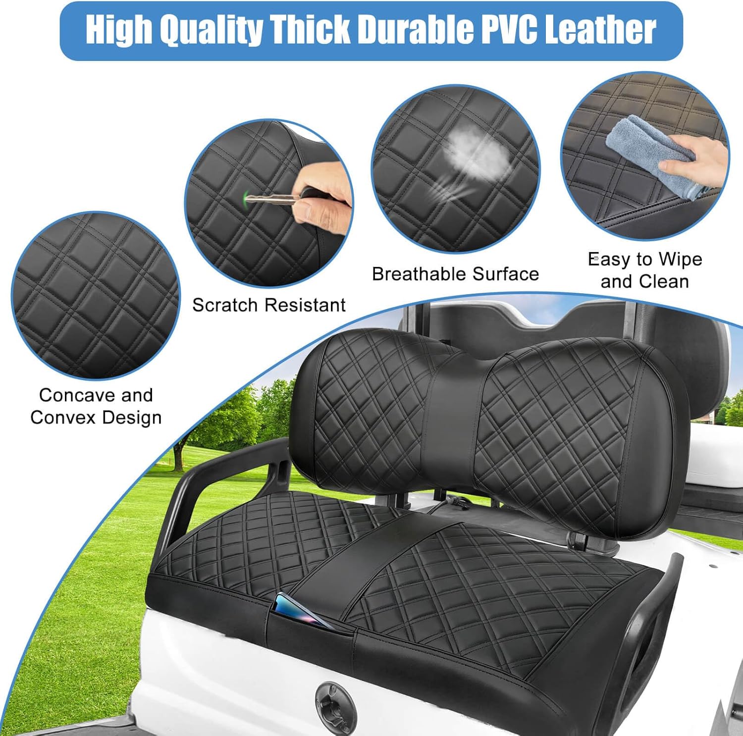 - ✅ Upgrade Design: ①Smooth vinyl PVC leather material and black color make it easy to clean and dirty resistance. ②Small pocket for storing keys, cards, Phone etc. ③Square concave and convex design appearance makes your golf cart brand new and fashionable.