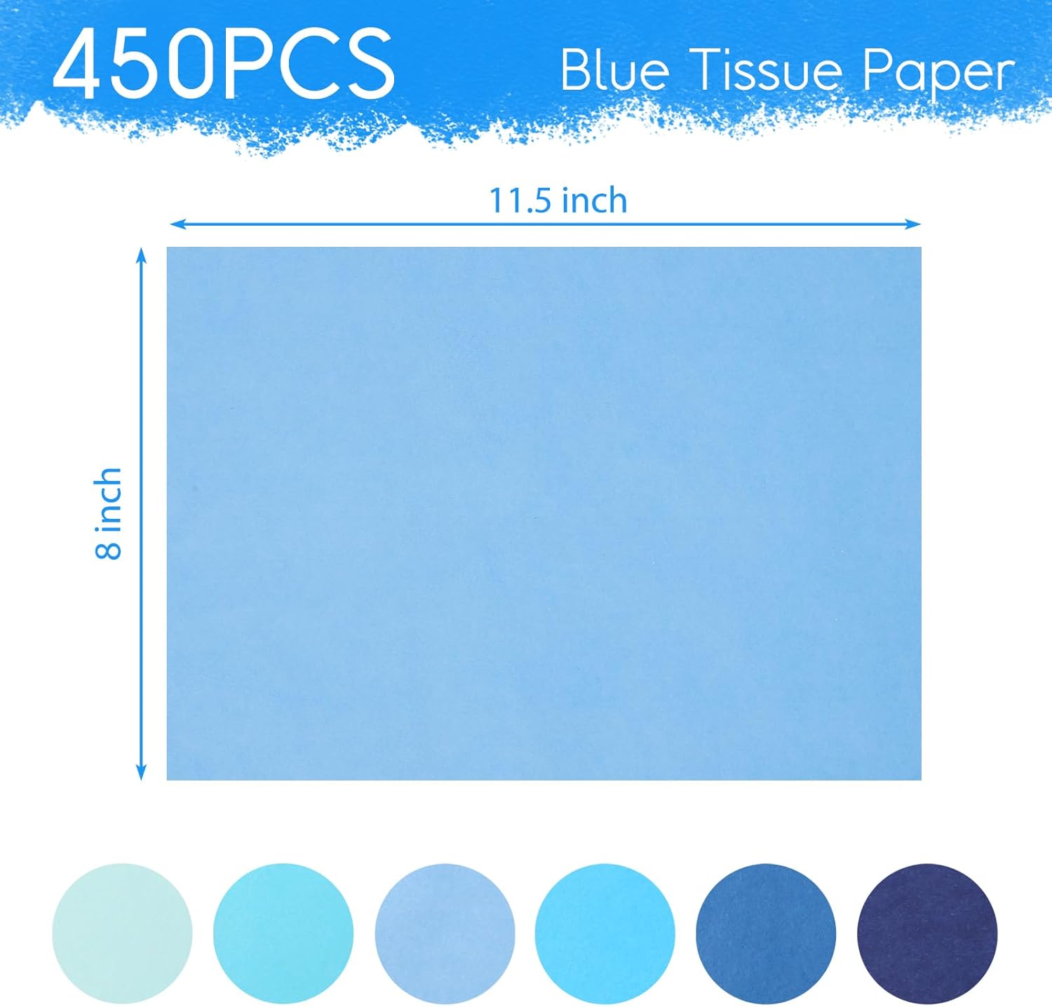 - Super Value Pack - In your package, you'll find an impressive 450PCS of tissue paper in various hues of blue (11.5" x 8", 6 different tones, 75pcs each), carefully curated to provide a harmonious color scheme.
