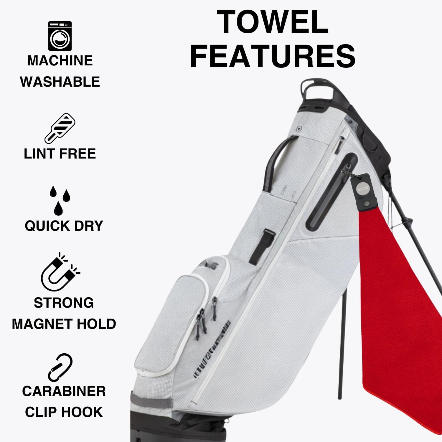 - HEAVY DUTY MATERIAL: Equipped with a removable aluminum alloy carabiner clip hook and magnet for easy attachment to golf gear. The magnetic pouch and hook can be removed for convenient machine washing. Its strong magnetic hooks keeps the waffle towel securely attached to irons, wedges, and putters, for fast, on-the-go pickup around the green.